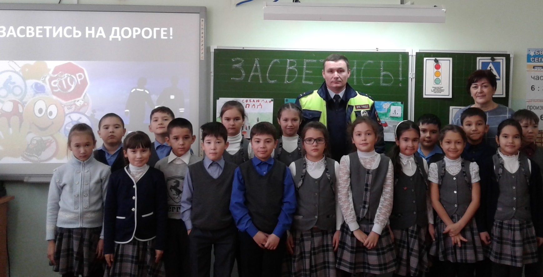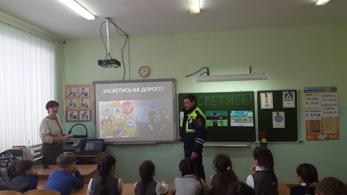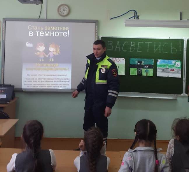 В рамках акции «Засветись!» на классный час обучающихся 3а и 3в классов был приглашен государственный инспектор дорожного надзора, старший лейтенант полиции Ф.Н. Гарипов. Финат Насимьянович отметил важность использования фликеров на дороге. Пешеход со световозвращателем заметен при свете фар на расстоянии до 400м. Поэтому риск наезда на пешехода в темное время суток снижается в 6-8 раз. Также обучающиеся повторили правила передвижения по обочине, перехода через дорогу. Вспомнили об опасностях, которые подстерегают тех, кто устраивает зимние игры вблизи проезжей части. Затем инспектор ответил на вопросы обучающихся.