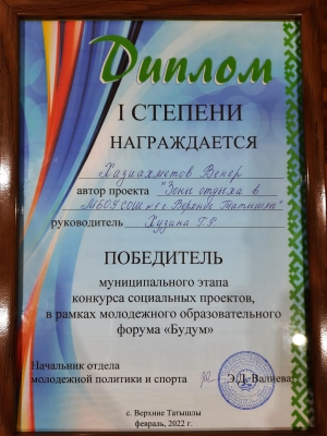 Победителем муниципального этапа стал Хазиахметов Венер, представивший проект «Бизнес-план реализации зоны отдыха в МБОУ СОШ №1 с.Верхние Татышлы» (руководитель Хузина Г.Р.).
