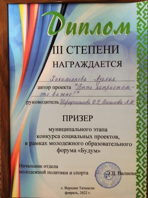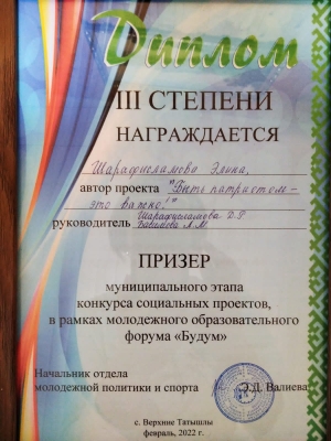 Обучающиеся Шарафисламова Элина и Хакимьянова Азалия защищали социальный проект «Быть патриотом – это важно!» (руководители Басимова Л.М., Шарафисламова Д.Р.). Ученицы стали призерами конкурса.