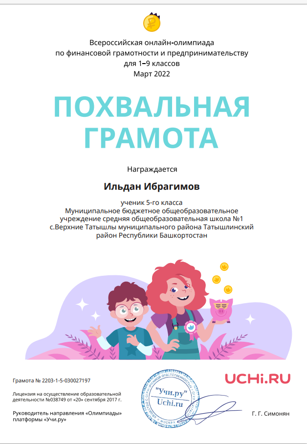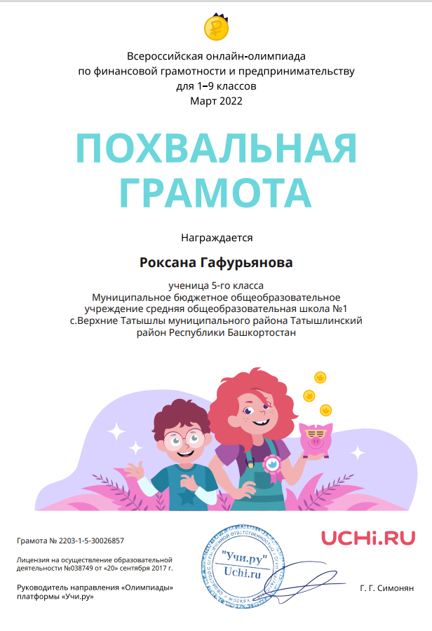 С 21 марта по 15 апреля 2022 года в России проходит неделя финансовой грамотности. Обучающиеся 5а класса активно участвовали во Всероссийской онлайн–олимпиаде по финансовой грамотности и предпринимательству для 1-9 классов. А также смотрели онлайн-лекции по данной теме.