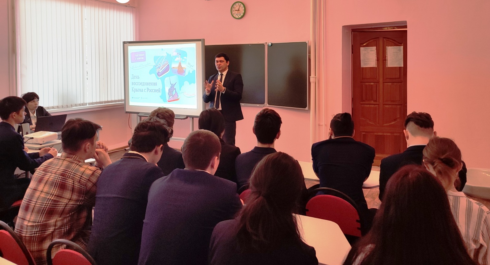 Сегодня понедельник, 20 марта, и по традиции рабочую неделю в школе начали с церемонии вноса Государственных флагов Российской Федерации, Республики Башкортостан и исполнения гимнов. На линейке присутствовал глава Татышлинского района Шайхисламов Фанур Рафисович. После линейки он посетил внеурочное занятие «Разговоры о важном» в 11 классах. Разговор был посвящен важному историческому событию - воссоединению Крыма с Россией. В ходе занятия ребята узнали об исторических событиях, связанных с воссоединением русского Крыма с Россией. Обсуждались причины и значение воссоединения России и Крыма, понятие «Русская весна». Небольшой исторический экскурс показал ребятам, что Крым – это исконно русская территория, олицетворение русской боевой славы и его возвращение – восстановление исторической справедливости.