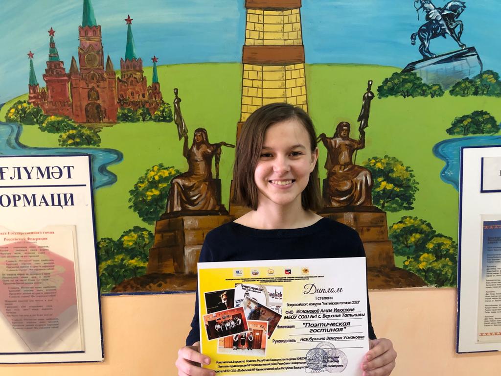 Ежегодно учителя-наставники вовлекают обучающихся нашей школы в интересные проекты, мероприятия, конкурсы различного уровня, в которых они достигают хороших результатов. По итогам IV Всероссийского конкурса «Английская гостиная – 2023» Ализа Исламова, обучающаяся 9а класса МБОУ СОШ №1 с. Верхние Татышлы, признана победителем в номинации «Поэтическая гостиная» и награждена Дипломом I степени.