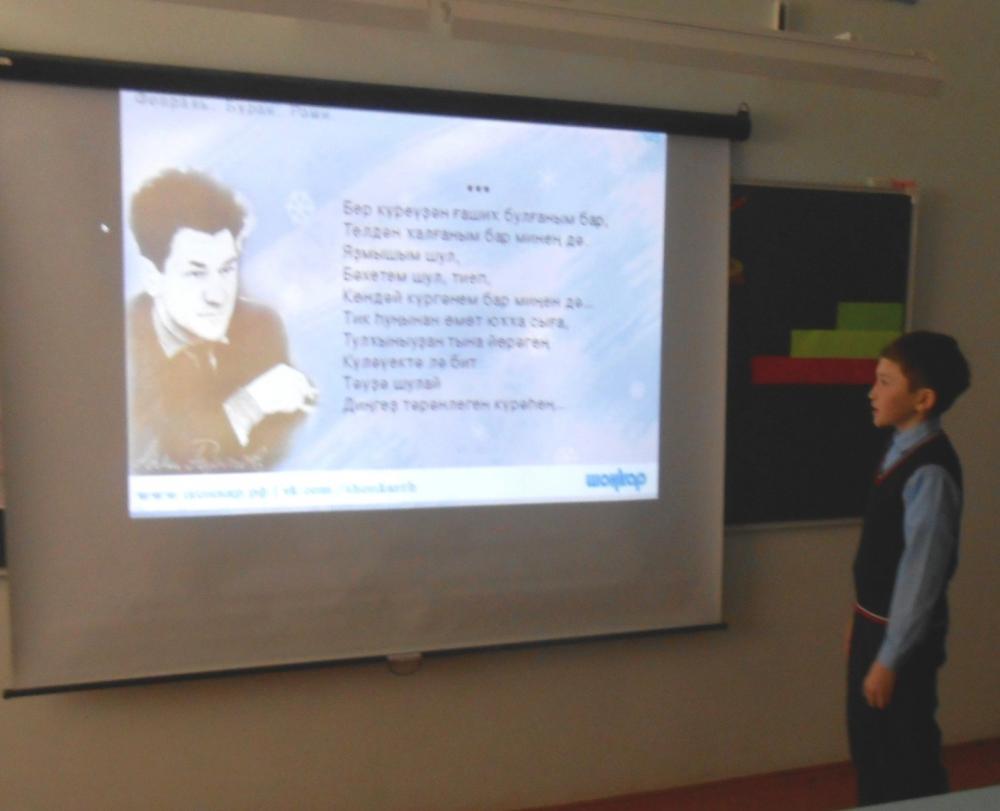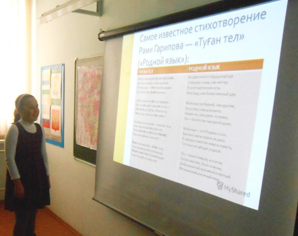 Каждый человек, который считает себя патриотом, должен знать своих поэтов, писателей. В феврале исполнился 85 лет со дня рождения выдающегося поэта Рами Гарипова, который защищал родной язык и литературу, свои принципы, которым он никогда не изменял. Нам очень близки его размышления об исторической судьбе народа, о духовной связи поколений, тревога за будущее родного языка и национальной культуры. Его стихотворения внесены в наши учебники. Ученики начальных классов умеют гордиться своими великими земляками и особенно трепетно относятся к творчеству поэтов, потому что они любят читать стихи. Дети внимательно изучали материалы презентации о поэте, поделились своими глубокими впечатлениями, слушали сообщение одноклассника, выразительно читали стихотворения Рами Гарипова, полистали сборник стихов, альбом.  Особенно впечатлила детей аудиозапись с голосом поэта. Они слушали его и обретали более высокий смысл жизни, счастье, мечты. Рами Гарипов писал: «Я  был небом, паря над облаками, я был землей, когда ходил по ней. Я был огнем, когда пылало пламя, я был водой, когда журчал ручей». Я хочу, чтобы жизнь молодого поколения также наполнилась заботами о делах и  о людях. Память о поэте, любовь к его творчеству всегда будет в наших сердцах, потому что обучающиеся пронесут их в свое светлое будущее. Мы считаем, что стихотворение «Туган тел» - главный завет поэта нам, потомкам своего народа.
