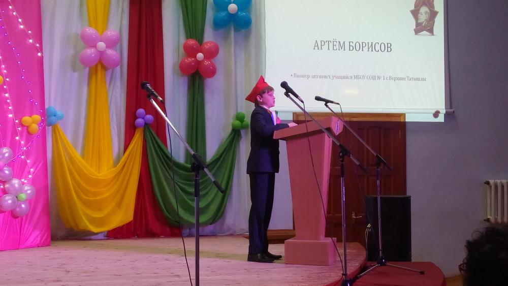 Праздник продолжился в зале Центра детского творчества. На мероприятии присутствовало много гостей, ветераны пионерского движения. Они поздравили ребят, коллектив Центра детского творчества с юбилейными датами и пожелали им служить Родине хорошими и добрыми делами. От имени всех пионеров района выступил обучающийся МБОУ СОШ №1 с.Верхние Татышлы и пожелал всем собравшимся здоровья, творческих успехов, оптимизма и быть везде и во всем первыми.