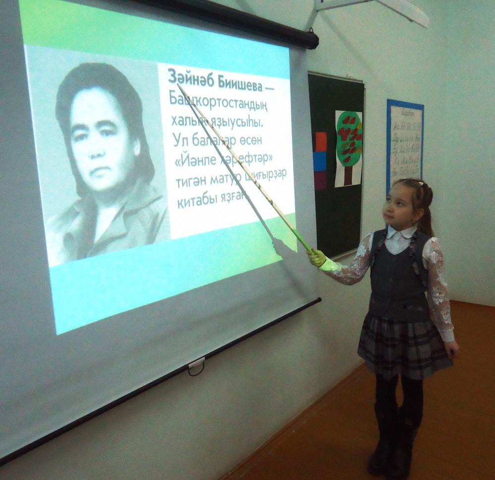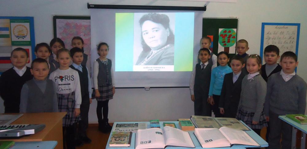 В 2018 году в Республике Башкортостан широко отмечается 110-летие народного писателя Зайнаб Биишевой. Она родилась 2 января 1908 года в деревне Туембетово Кугарчинского района Башкортостана. Ее произведения – это целый мир, где светлое всегда побеждает. И в МБОУ СОШ №1 с.Верхние Татышлы проходят мероприятия памяти, занятия по систематизации и обобщения знаний учеников о жизни и творчестве З. Биишевой. Обучающиеся башкирских групп 1 - 4 классов под руководством учителя Л.Р. Фатхуллиной провели занимательные беседы, занятия по изучению и расширению знаний о детской поэзии, прозе Зайнаб Биишевой. Они сопровождались электронными презентациями, посвященными талантливой писательнице. Детям очень понравились аудиозаписи стихотворений в исполнении самой Зайнаб Абдулловны. Они оставили глубокие впечатления. В ходе занятий девочки и мальчики выразительно читали стихотворения уважаемой писательницы, внимательно рассматривали материалы папки, башкирской энциклопедии, календаря, республиканских газет, отвечали на вопросы тестовых заданий о жизни, творчестве З. Биишевой. Учитель призвала детей чаще обращаться к книгам Зайнаб Биишевой, чтобы не иссяк интерес к творчеству нашей необыкновенной писательницы. Дети с учителем пришли к мнению, что в этом основным помощником будет, конечно, библиотека.