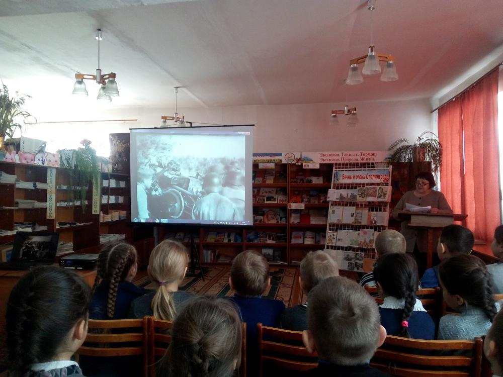 1 февраля обучающиеся 2б и 2 г классов под руководством классных руководителей Л.Ш. Муллануровой и Р.Р. Нисаповой собрались в Детской Модельной Библиотеке, чтобы отметить замечательную дату – 75 лет Победы под Сталинградом и почтить память погибших солдат, защитивших город, ставший городом – героем Волгоград! Юбилейная дата наступит 2 февраля 2018 года. 200 героических дней обороны Сталинграда вошли в историю, как самые кровопролитные и жестокие. Наши советские солдаты стояли насмерть за каждый дом, за каждый этаж, за каждый кусочек земли. И они победили! Отстояли Сталинград! Всех героев не назвать поименно, но их помнят, в их честь называют дома, улицы, зажигают вечный огонь. Война затронула каждую семью. И в нашем районе, в нашей школе есть дети, чьи прадедушки защищали Сталинград .