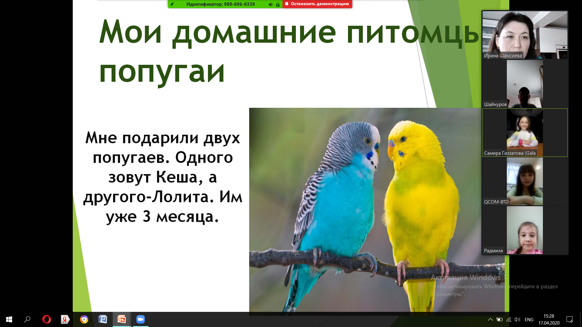 17 апреля в 1 а классе МБОУ СОШ №1 С.Верхние Татышлы прошел онлайн -урок по окружающему миру. Ребята защитили свои проектные работы на тему «Мои домашние питомцы». Обучающиеся показали и рассказали о своих любимых питомцах, как их зовут, сколько им лет, чем занимаются их питомцы целыми днями, как питаются. У многих ребят их питомцы реагируют на свою кличку, у кого- то обучены различным трюкам. Также рассказали интересные случаи, которые произошли с их питомцами, а самое главное, как правильно нужно ухаживать за ними.