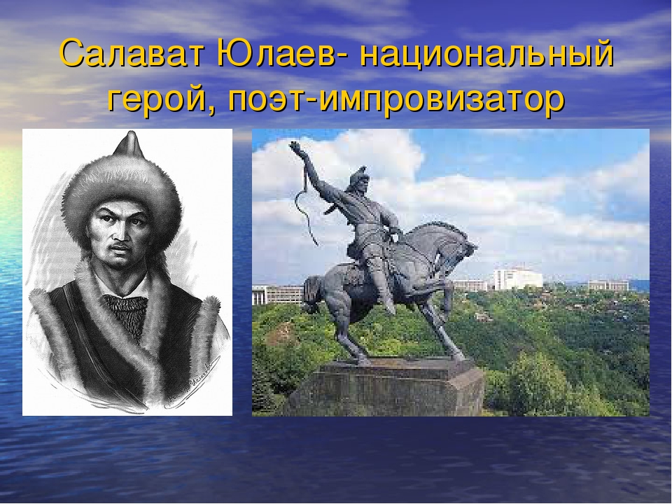 Салават Юлаев был воином и поэтом. Он возглавлял башкирские дружины в Крестьянской войне 1773-1775гг, защищая родные просторы Урала. Он писал прекрасные стихи, например, Стрела " ("Ук") , " Юноше-воину " ("Егеткэ") , " Мой Урал" ("Уралым") .
