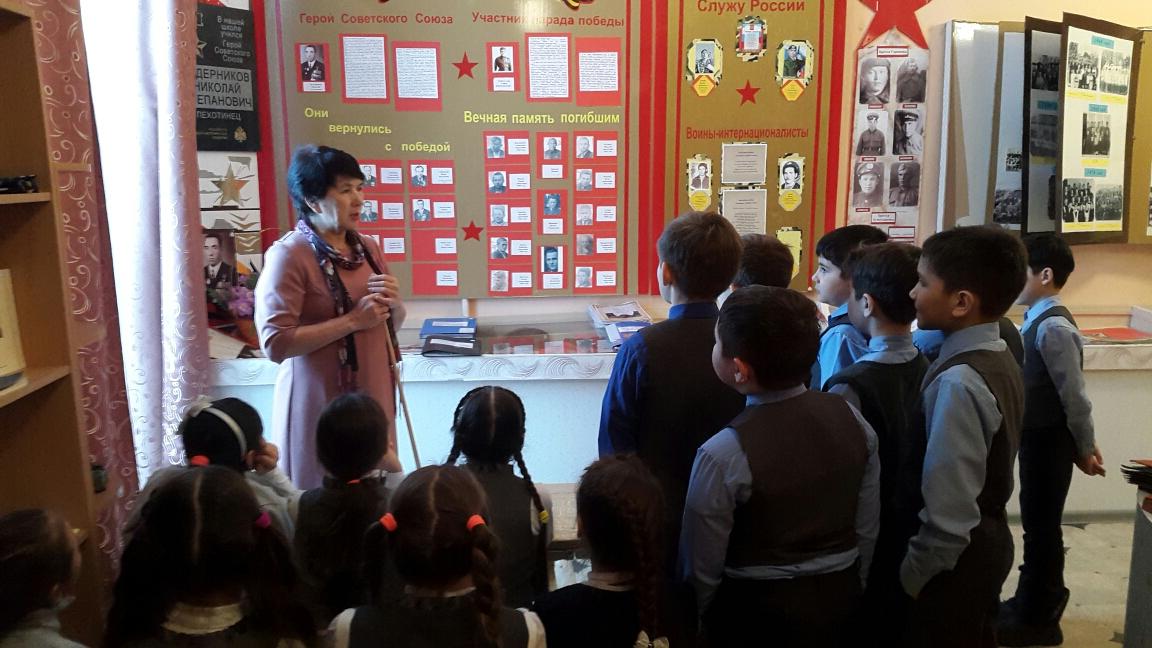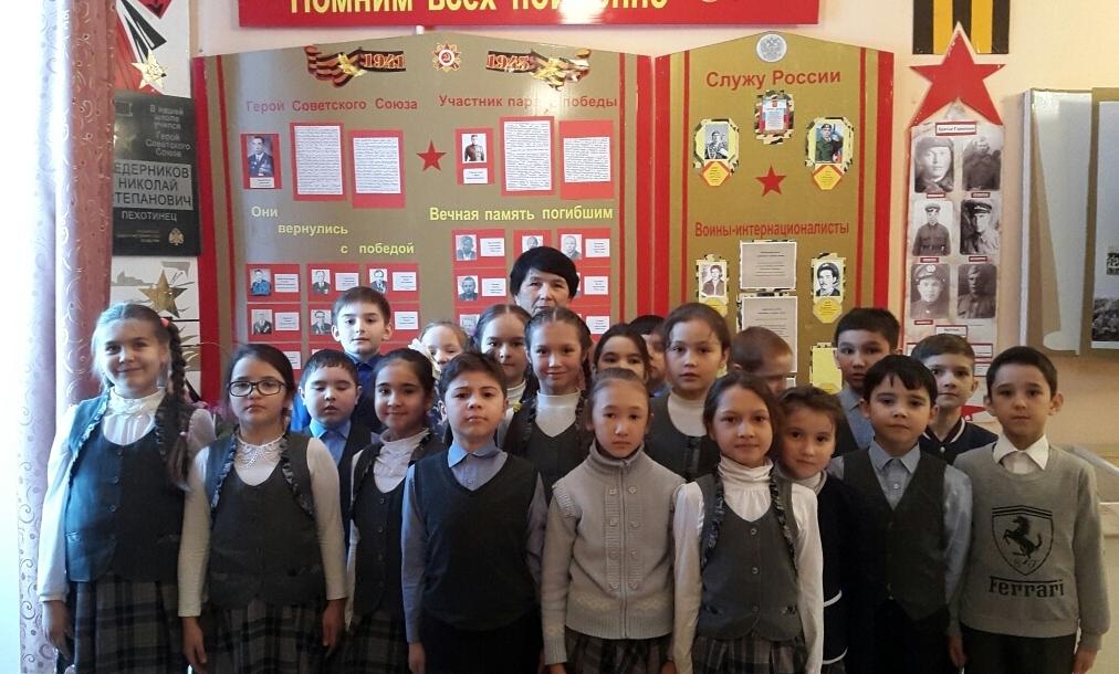 21 февраля обучающиеся 3а класса дружно направились в наш школьный музей. Там их встретила директор музея КарамоваЛинарияСаматовна. Она познакомила детей с историей возникновения праздника,рассказала о мужестве и героизме нашего народа в разные годы истории. Ребята с интересом слушали рассказ ЛинарииСаматовны о выпускниках нашей школы, о Ведерникове- герое Великой Отечественной войны, о воинах-интернационалистах. Учащиеся узнали о том, что в декабре 1979 года советские войска вошли в Афганистан, что длилась она долгих 10 лет. В этой войне было много погибших, в том числе и из нашего района. Потом ребята сделали вывод, что служить Отечеству в наше время - это значит оберегать мирную жизнь нашего народа , это хранить честь и достоинство своей Родины и что, наша армия всегда была самой сильной.