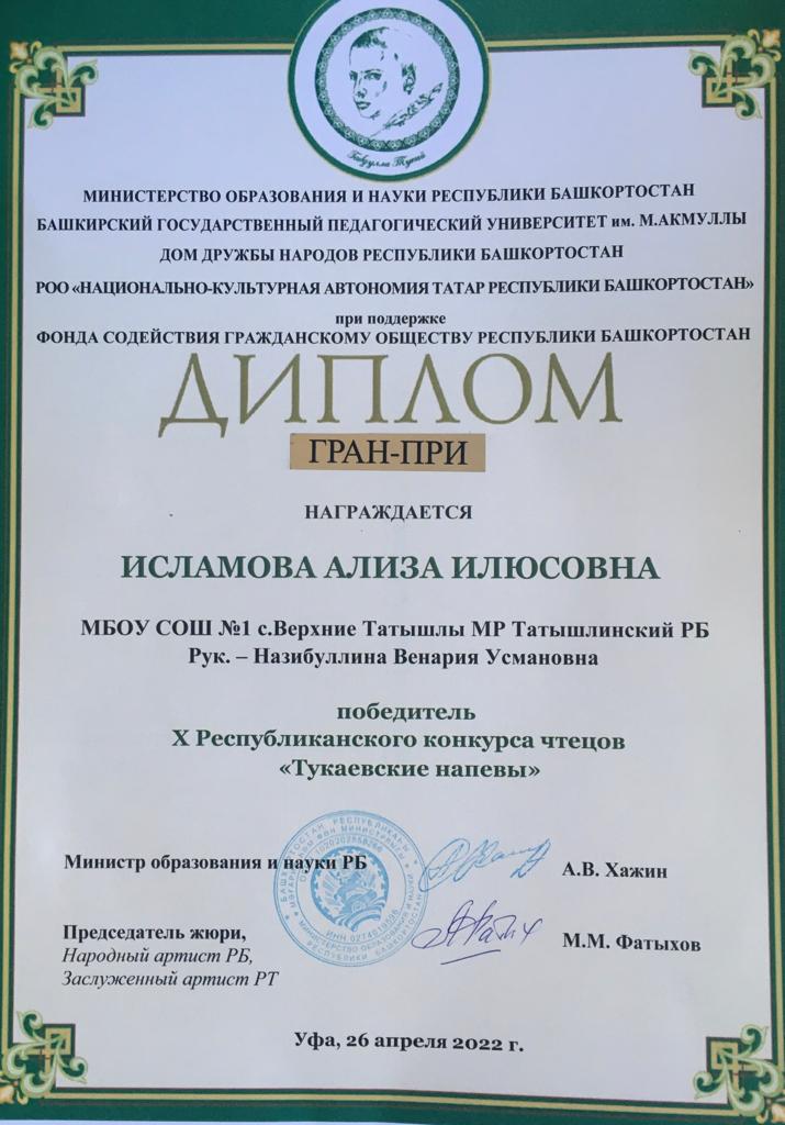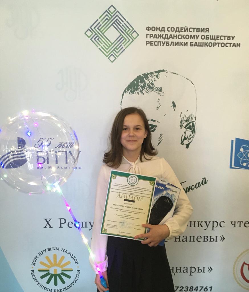 Ализа Исламова, обучающаяся 8а класса МБОУ СОШ №1 с.Верхние Татышлы, финалист конкурса, в номинации «Индивидуальное выступление» на английском языке стала обладателем ГРАН – ПРИ конкурса! Конкурсанта подготовила Венария Усмановна Назибуллина, учитель английского языка. Поздравляем Ализу и руководителя с прекрасным выступлением и желаем новых творческих успехов!