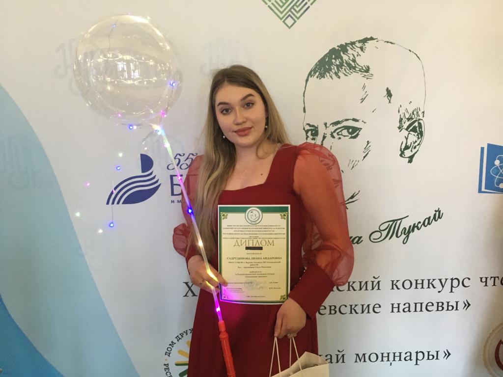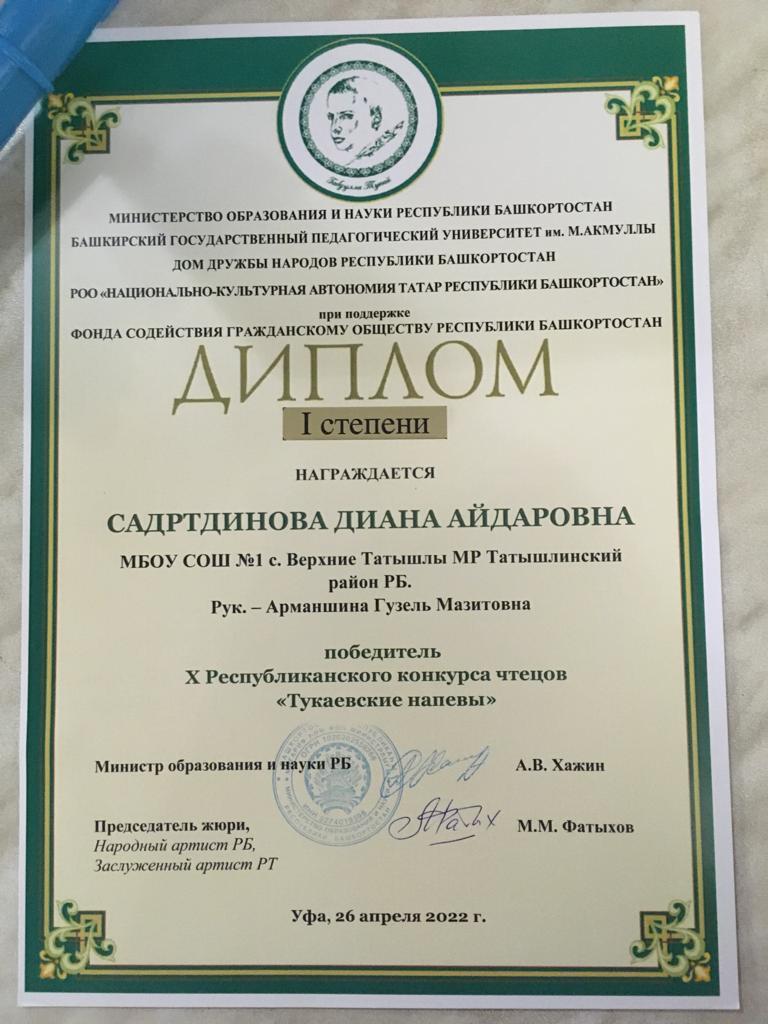 26 апреля 2022 года Диана Садртдинова, обучающаяся 9в класса МБОУ СОШ №1 с.Верхние Татышлы, приняла участие на заключительном этапе Х Республиканского фестиваля чтецов «Тукаевские напевы». Выступление Дианы в финале было ярким и эмоциональным. В результате она заняла 1 место в конкурсе! Поздравляем Диану и ее руководителя Гузель Мазитовну Арманшину с блестящим результатом и желаем им дальнейших успехов и новых побед!