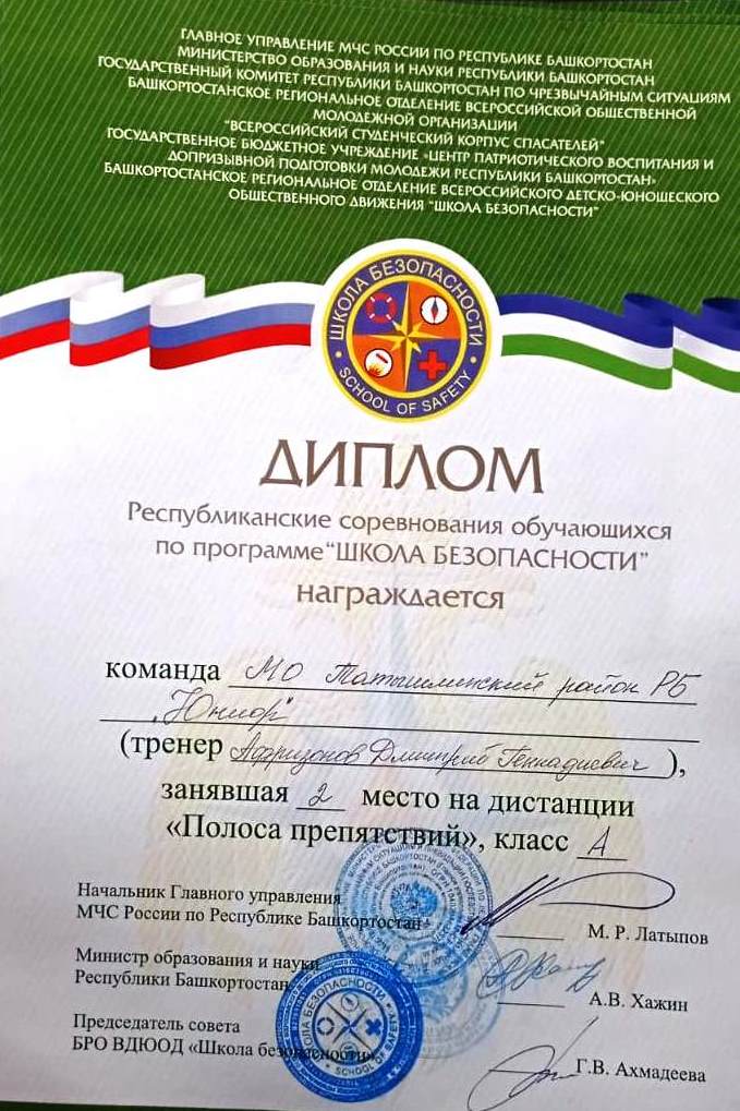 Наша команда в составе Галлямовой Алсу, Валинуровой Лилии, Тимерхановой Камиллы, Хакимьяновой Азалии, Сайфуллина Реналя, Хайдаршина Ильнура, Кунакбаева Димитрия, Равилова Ильдара с достоинством выступила и защитила честь района. Они стали первыми в эстафете, вторыми в полосе препятствий, третьими в поисково- спасательных работах. Сайфуллин Реналь занял личное третье место в эстафете.