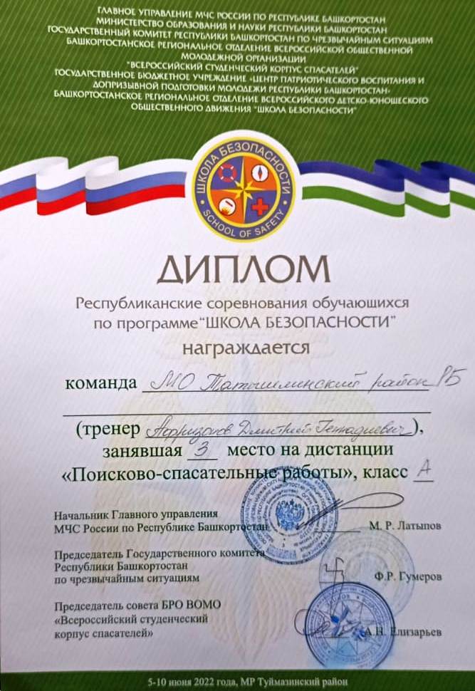 С 6 по 9 июня 2022 года в Туймазинском районе республики прошли республиканские соревнования Школы безопасности, в которых Татышлинский район представляла команда МБОУ СОШ №1 с.Верхние Татышлы под руководством тренера Дмитрия Геннадиевича Афризонова. Участникам 52 команд из разных районов Республики Башкортостан предстояло пройти испытание, состоящее из 12 дисциплин.