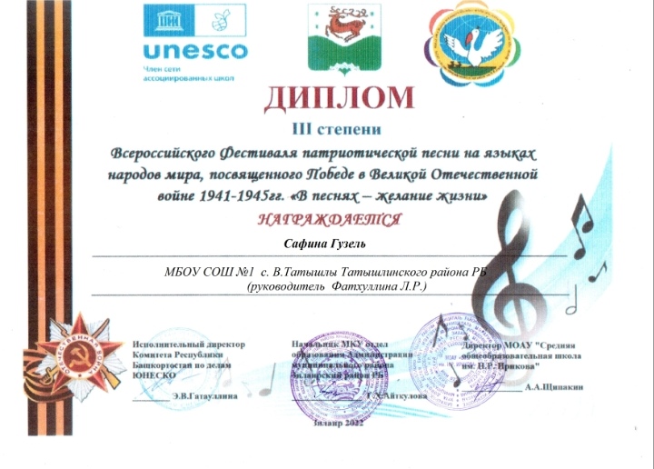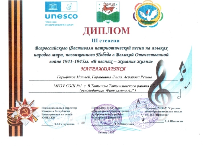 Комитет Республики Башкортостан по делам ЮНЕСКО в содействии с Министерством образования и науки РБ, Клубов ЮНЕСКО Российской Федерации заочно организовал фестиваль-конкурс патриотической песни на языках народов мира под названием "В песнях-желание жизни", посвящённый Победе в ВОВ 1941-1945гг. Заявки принимались до 6 мая 2022 года. Конкурс проводился на базе Ассоциированной школы ЮНЕСКО - СОШ имени Н. Р. Ирикова с. Зилаир МР Зилаирский район по трём направлениям:патриотические песни, песни военных лет, песни о родине. В младшей группе (1-4 кл.,номинация:соло) по направлению "Патриотические песни" участвовала обучающаяся 4в класса МБОУ СОШ №1 с. Верхние Татышлы (рук. Фатхуллина Л. Р.) Гузель Сафина. На днях опубликованы итоги. По результатам конкурса Гузель Сафина стала победителем 3-й степени. Ещё в младшей группе (номинация:трио) по направлению" Песни о родине" Матвей Гарифянов, Луиза Гарайшина, Регина Асрарова (рук. Фатхуллина Л. Р. ) стали победителями 3-й степени. От всей души поздравляем наших обучающихся и их руководителя с большими успехами и желаем им новых побед!