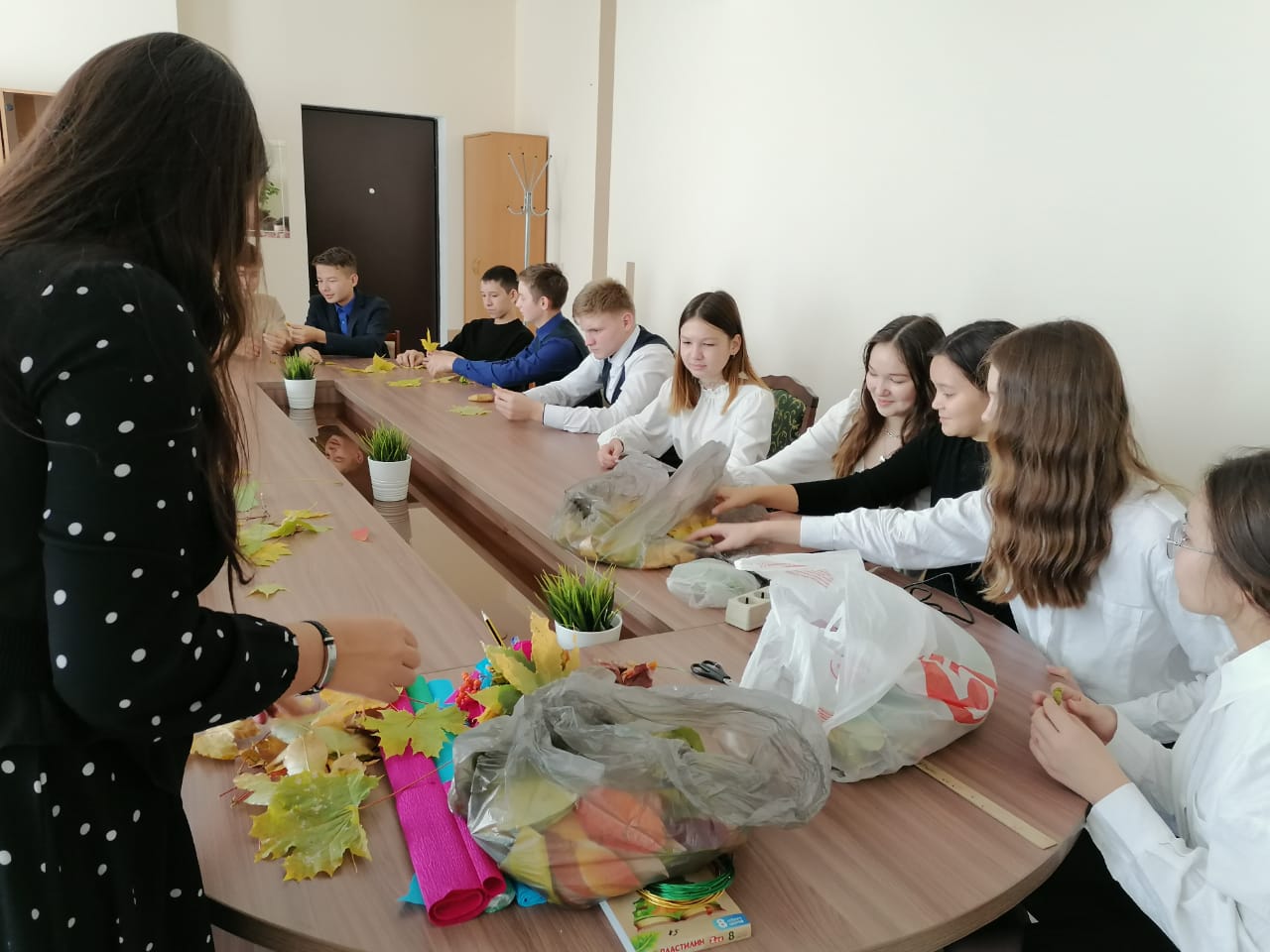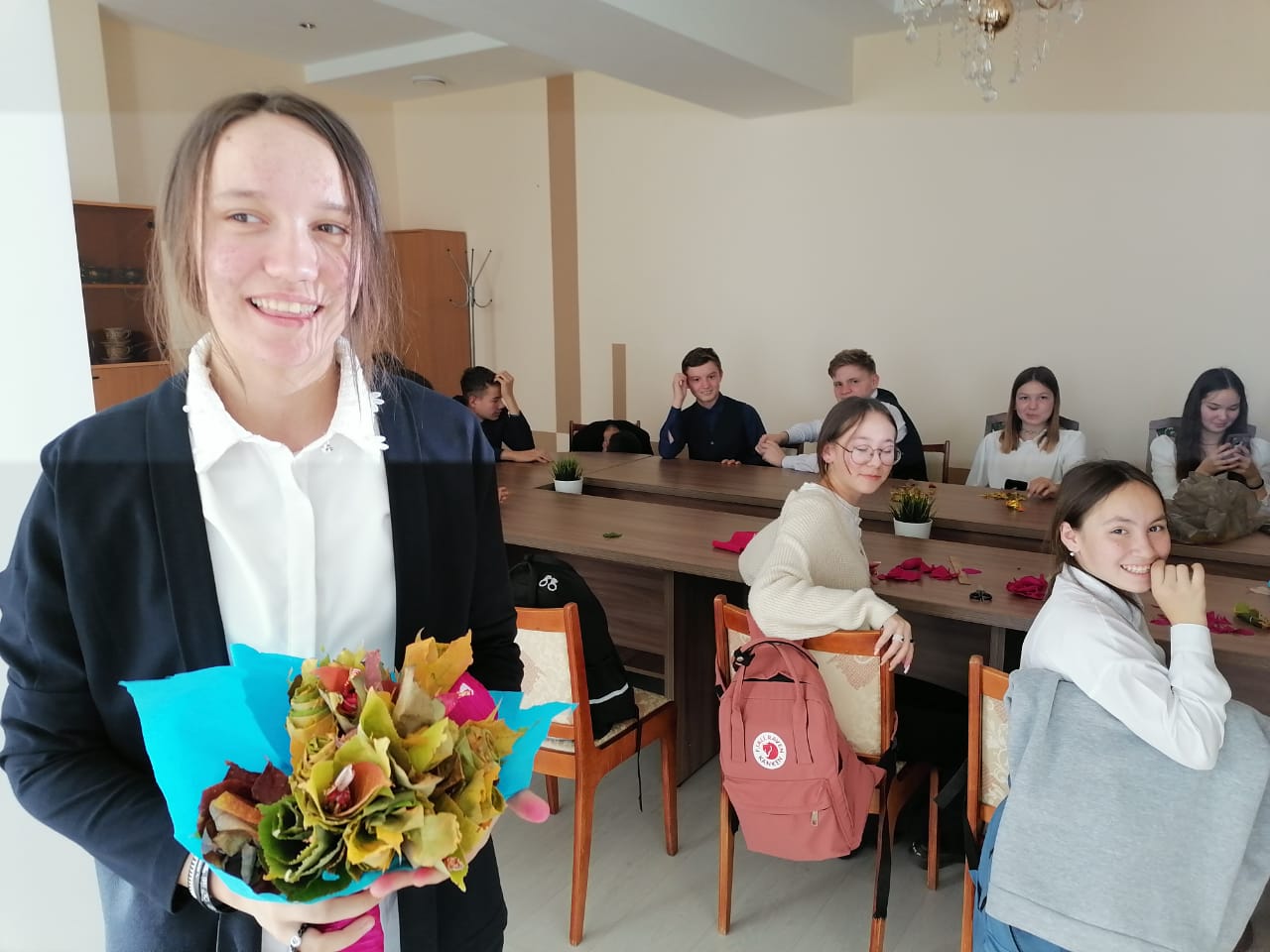 4 октября в преддверии Дня учителя ребята 8б класса вместе с классным руководителем Г. Р. Хузиной посетили мастер-класс, где им предложили сделать своими руками красивый букет из конфет и гофрированной бумаги, обрамленный осенними листьями и дополненный школьной атрибутикой. Лариса Гаялова пошагово показала детям составление букета и провела беседу о профессии учителя.