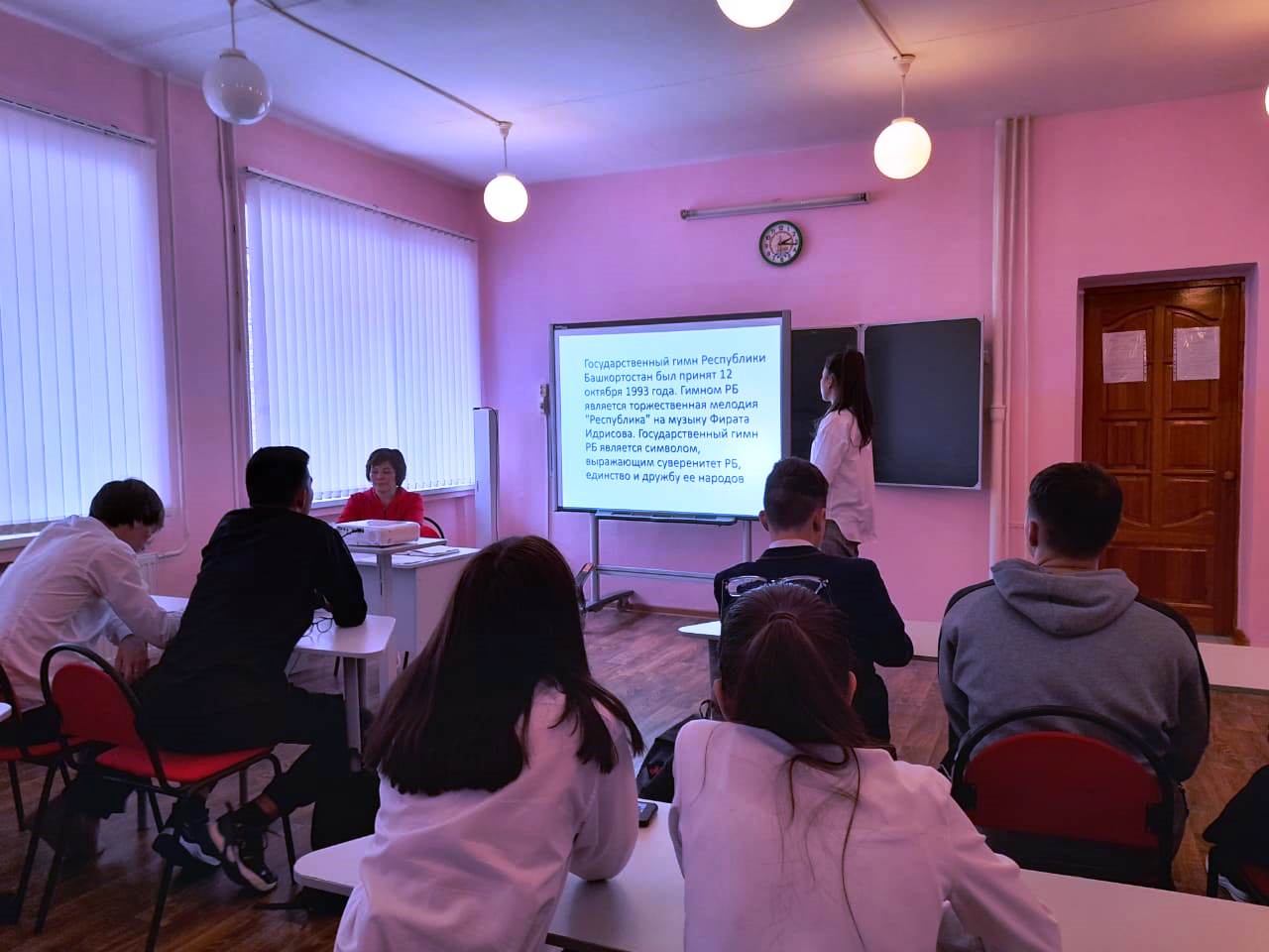 7 октября 2022 года, в рамках празднования Дня Республики Башкортостан, в 11а классе прошел классный час «Башкортостан - мой край родной». Во время беседы учащиеся закрепили свои знания о символике республики, о значении цветов и эмблем, с гордостью слушали гимн республики.
