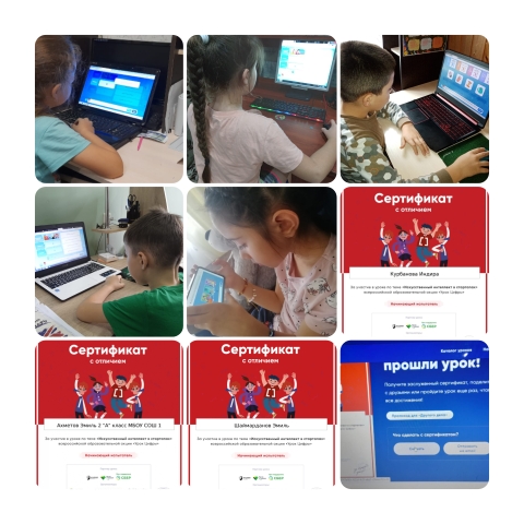 Обучающиеся начальных классов приняли участие во Всероссийской образовательной акции "Урок Цифры" по теме "Искусственный интеллект в стартапах". Ребята узнали много интересной информации, прошли тренажёр и получили сертификаты.