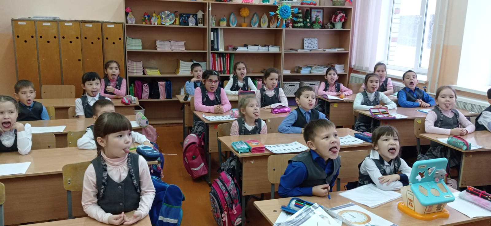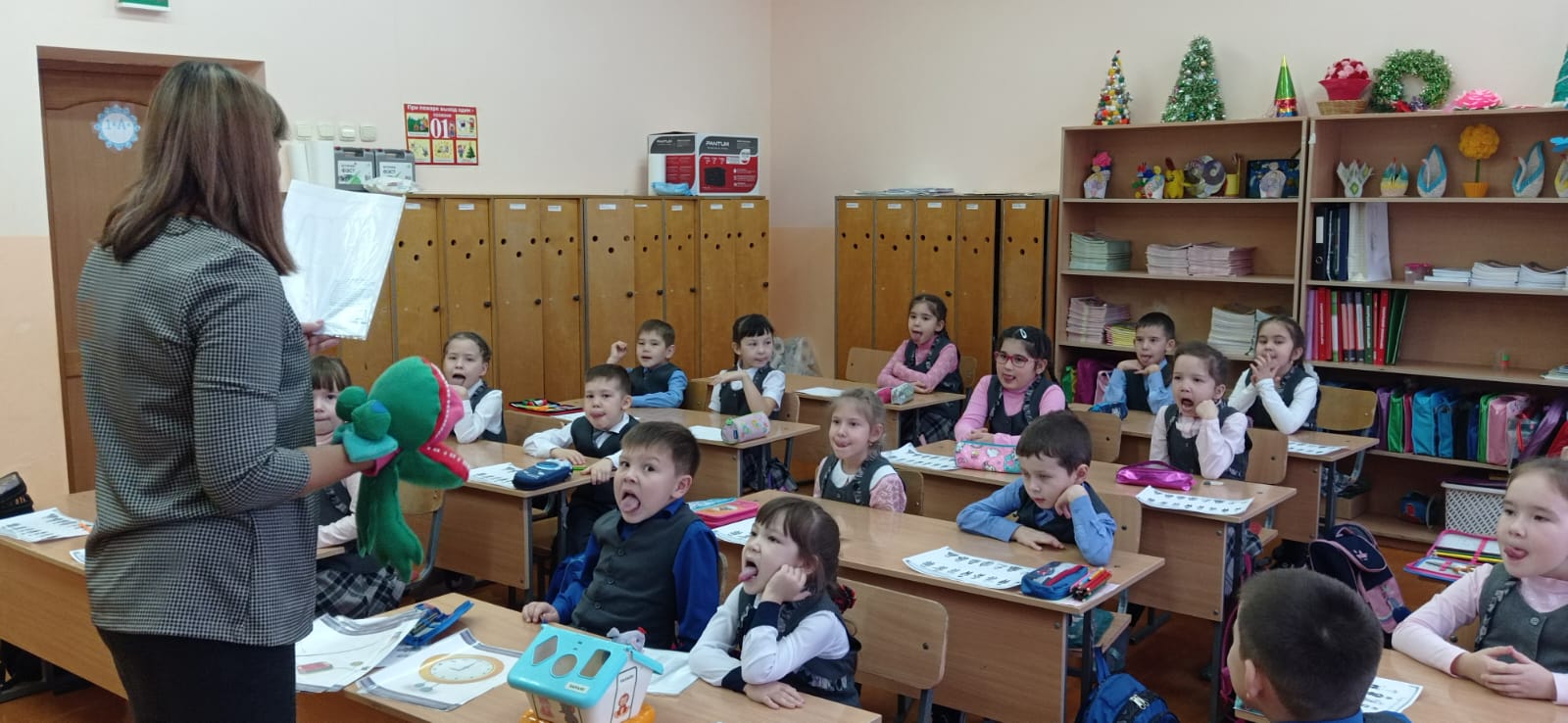 Учителя-логопеды школы Хамитова А.Ф. и Гараева Л.Г. постарались сделать этот день интересным и насыщенным. В гости к первоклассникам Лузина Габдулхаевна привела озорного Мышонка и Лягушку-говорушку, которые провели с ребятами «Веселую артикуляционную гимнастику».