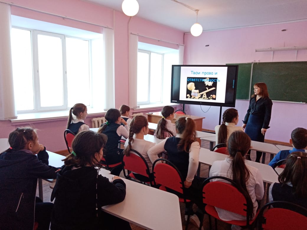 В рамках Недели правовых знаний 17 ноября социальный педагог Ханова З.Ф. с обучающимися 5а, 5б классов провела устный журнал «Твои права и ответственность». В своем выступлении она ознакомила учащихся с историей возникновения Всемирного дня ребенка и Всероссийского дня правовой помощи детям, с международными правовыми документами: Декларацией прав ребенка, Конвенцией о правах ребенка. Рассказала о том, что по мере взросления дети приобретают новые права, обязанности и ответственность, таким образом, меняется правовой статус ребенка. Ознакомились с основной переченью прав, обязанностей и ответственности в зависимости от возраста.