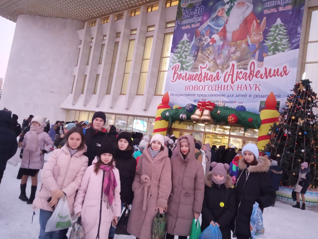 Ребята увидели новогоднее представление «Волшебная академия новогодних наук», в фойе зала их ждала развлекательная программа с участием сказочных персонажей, Деда Мороза и Снегурочки.