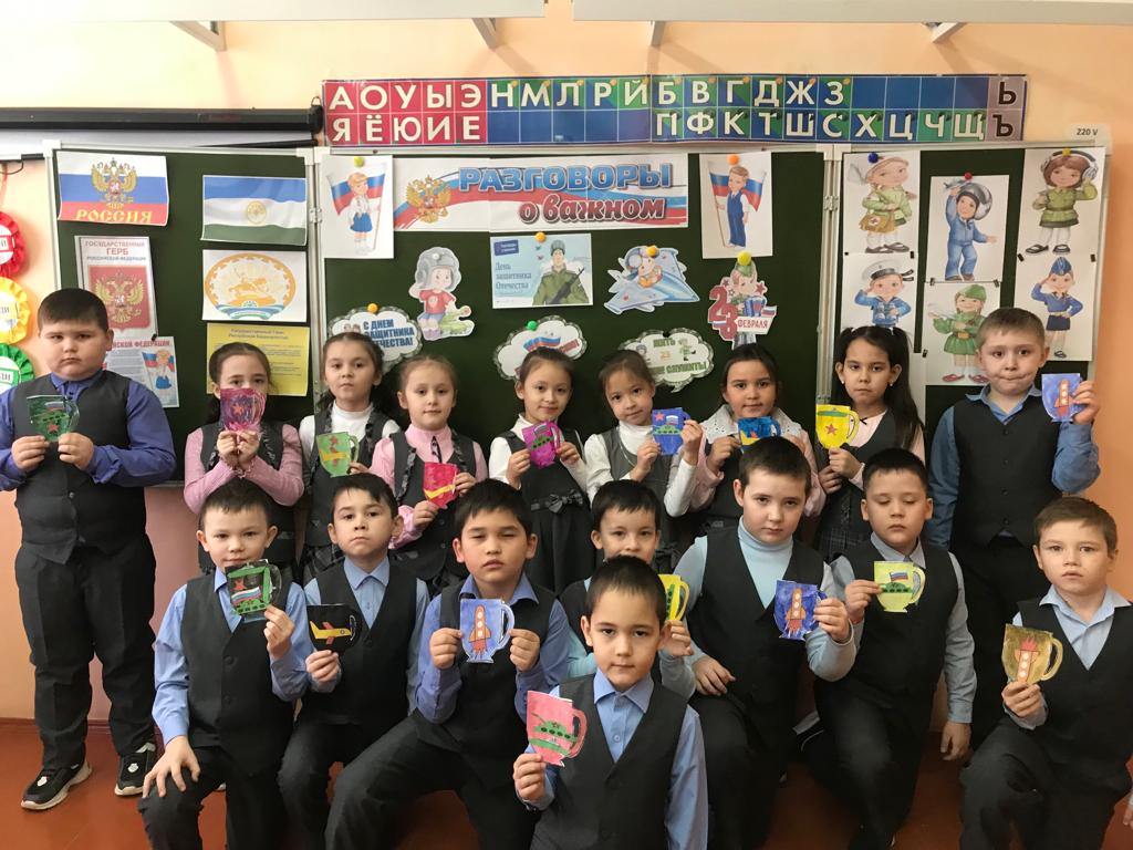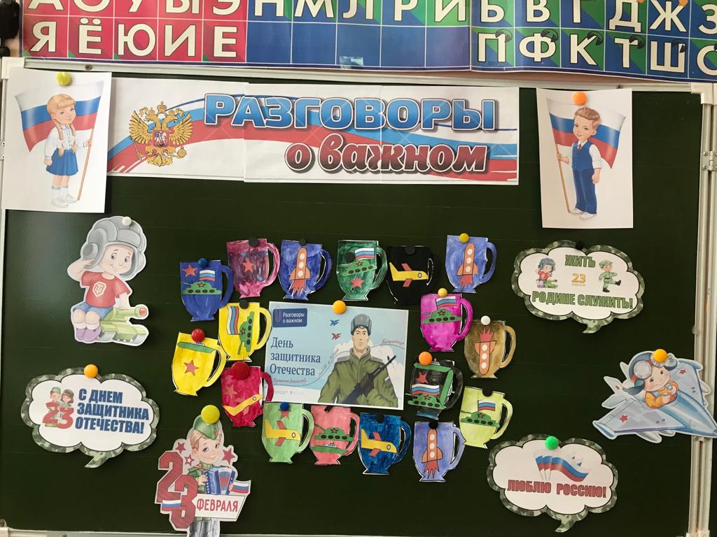 20 февраля в 1в классе проведено внеурочное занятие «Разговоры о важном». Темой занятия стал приближающийся праздник — День Защитника Отечества. В ходе занятия ребята обсудили, что означает слово «защитник», выполнили задания в рабочих листах, посмотрели видеоматериал «Вооружённые силы России». А в конце занятия сделали поделку «чашка солдата».