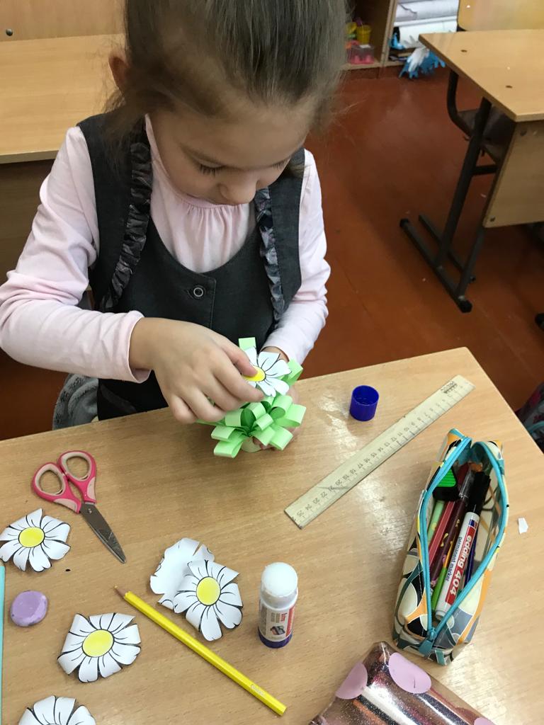 Ребята, работая в рабочих листах, познакомились и обсудили роль наставников и учителей, соединили части пословиц, выбрали слова благодарности. В конце занятия в знак признательности своим наставникам и учителям решили сделать подарок- букет из ромашек.