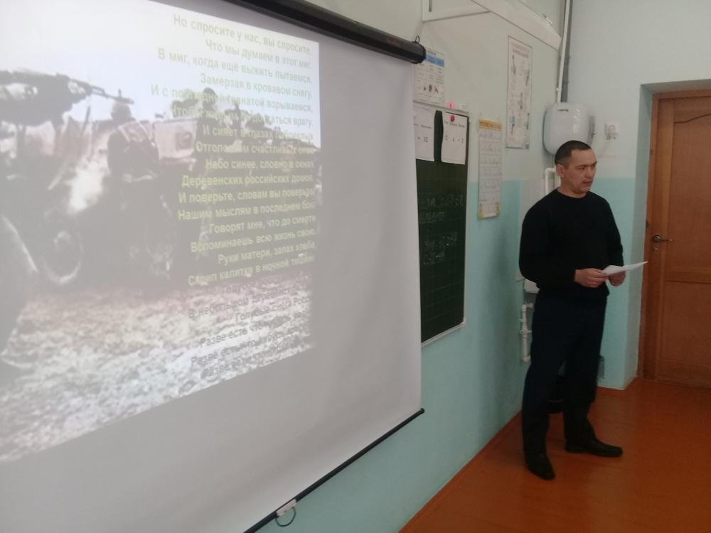 прошел Урок мужества. На это мероприятие был приглашен участник боевых действий в Чеченской Республики Карамов Рустам Юнысович. Он познакомил учащихся с требованиями, предъявляемыми для службы в армии. Дети задавали интересующие их вопросы. Рустам Юнысович принес фотографии, которые дети с удовольствием посмотрели на классном часе.