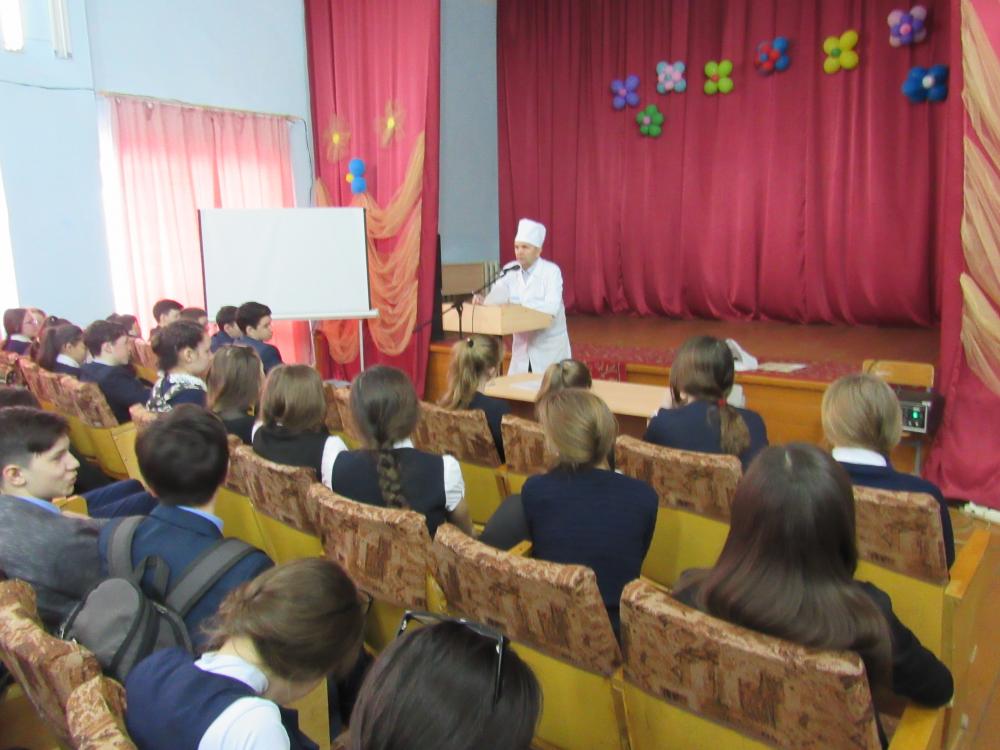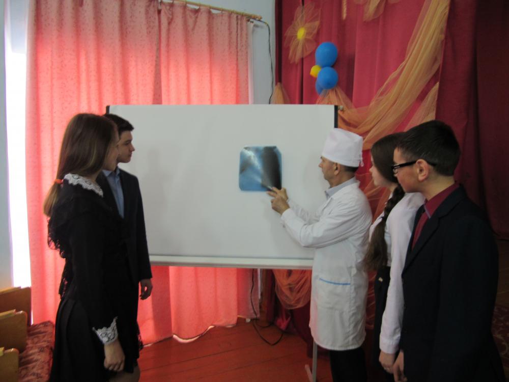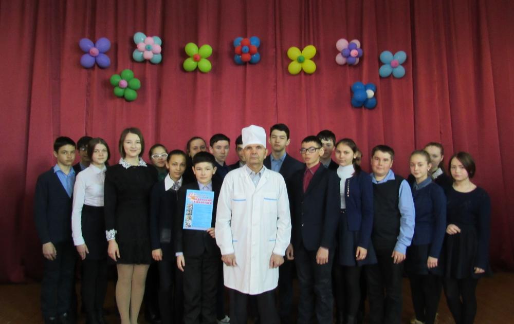районной поликлиники пригласили врача-фтизиатра высшей категории Рафаэля Салихьяновича Шафиева. Он рассказал обучающимся 8-11 классов о возникновении заболевания, о мерах профилактики и лечения туберкулеза, показал ребятам рентгеновские снимки, ответил на вопросы.