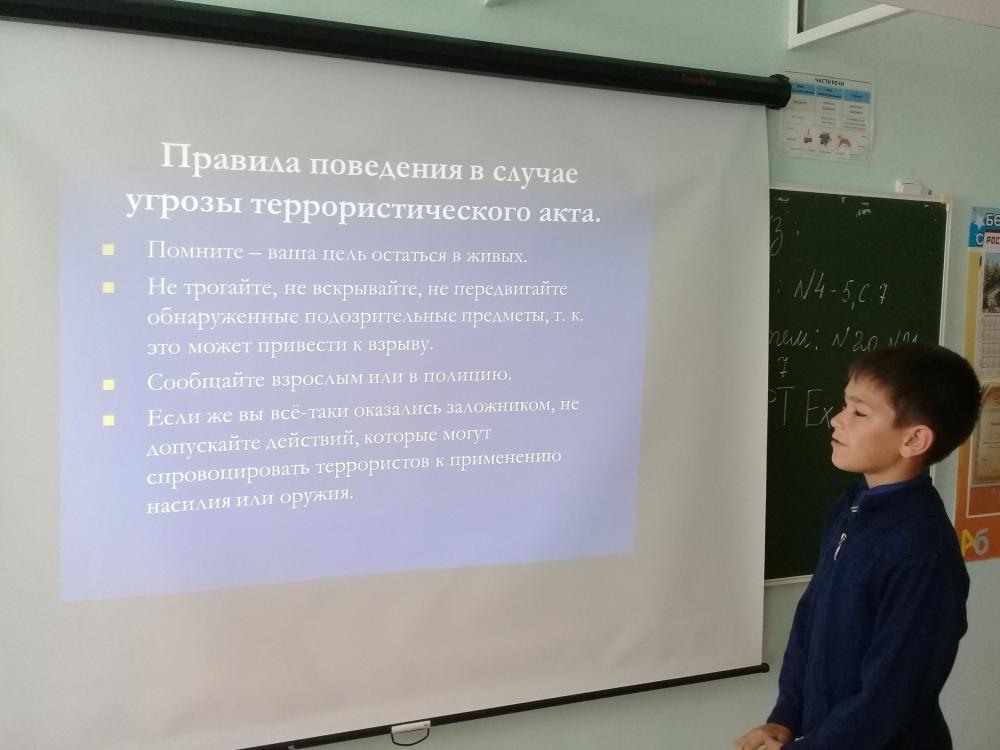 Был организован просмотр и обсуждение презентации «Терроризм – угроза обществу». В презентации наглядно демонстрировались трагические последствия террористических актов, имевших место в истории нашей страны. А также обучающиеся познакомились с правилами поведения в случае угрозы террористического акта.
