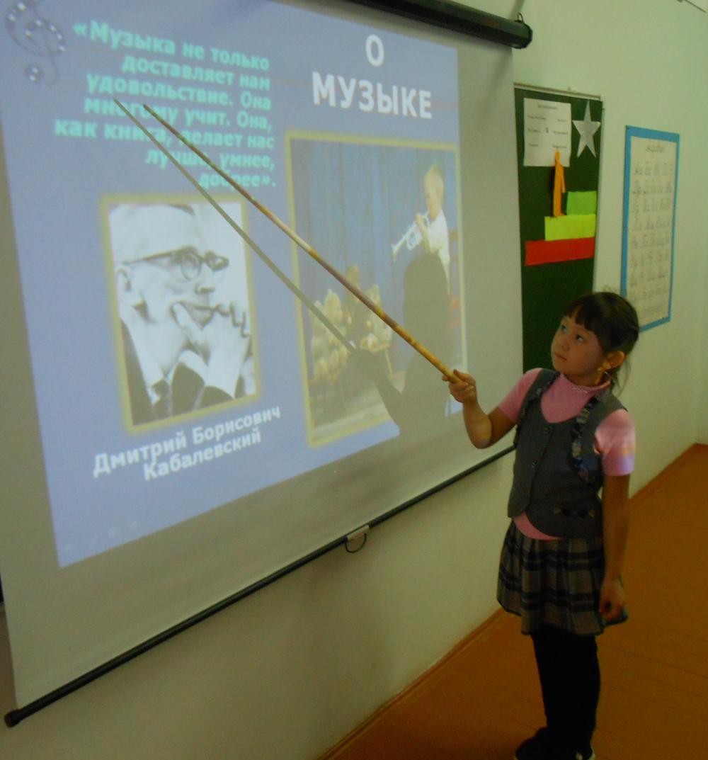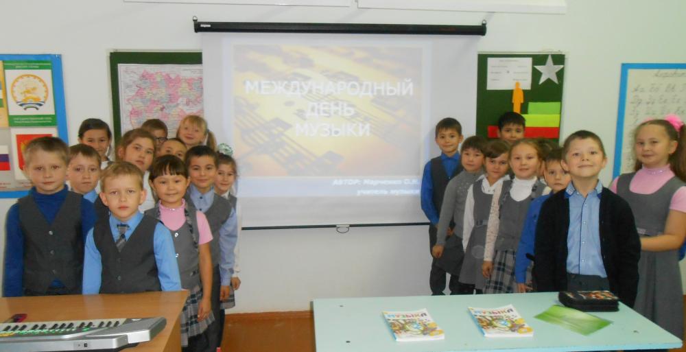 Занятия музыкой очень полезны для детей. Они улучшают работу мозга. Обучение музыке укрепляет память. Она также помогает найти себя в мире и жить в гармонии с этим миром, с самим собой. Отрадно, что наши обучающиеся с нетерпением ждут занятия с музыкой, где они слушают, рисуют, анализируют эту музыку, развивают свой голос. Когда дети поют, их осанки становятся гордыми и баян звучит звонче и веселее. Да, мы с детьми, любителями музыки - огромная сила и дружба на земле. Вот первоклассник сидит и изображает звуки осени на листе бумаги и радостно кричит: «Учитель, я видел это дерево на улице!». В занятии, посвященном к Международному дню музыки, обучающиеся 2в класса рассказали одноклассникам об этой дате, об инструментах, о композиторах, играли в ансамбле, пели, отдыхали под ритмами физкультминутки, угадывали названия музыкальных произведений и их авторов, поднимались на ступеньки успеха. Детям очень понравилась презентация.