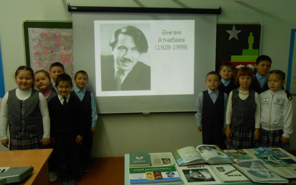 Со дня рождения народного поэта Республики Башкортостан, лауреата республиканской премии Г. Саляма, заслуженного деятеля искусств РСФСР и БАССР Ангама Атнабаева исполняется 90 лет. Творчество нашего выдающегося земляка особенно вдохновляет нас на добрые дела, на теплые беседы и мероприятия. Наши обучающиеся – многократные призеры и победители районного фестиваля - конкурса поэзии «Родники Курдыма», посвященного творчеству Ангама Атнабаева. Учитель начальных классов, лауреат премии имени Ангама Атнабаева Фатхуллина Л.Р. учредила на этот конкурс поэзии два призовых Диплома, так как в районе очень много талантливых детей-чтецов. В этом ее поддержали администрация района и отдел культуры МР Татышлинский район. И в этом году дети радостно встречают юбилей любимого поэта, первоклассники знакомятся с творчеством знаменитого земляка. Обучающимся 1б класса башкирской группы стало очень интересным занятие, посвященное юбилею народного поэта РБ. Дети увлеченно листали страницы книг, газет, альбомов, изучали слайды презентации, по аудиозаписи слушали стихи в исполнении самого поэта, второклассники выразительно читали стихи. Детям очень понравилось стихотворение об одиннадцати мальчишках. Одним словом, дети, учителя гордятся своим земляком, благодарны ему за красивые стихи о родной земле, о друзьях, о мире на земле.