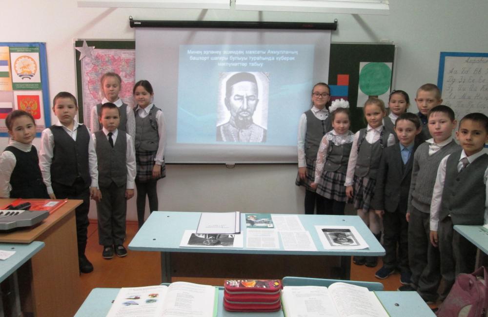 14 декабря 2017 года в нашей республике День башкирского языка, приуроченный к дню рождения великого поэта– просветителя Мифтахетдина Акмуллы. Обучающиеся начальных  классов под руководством учителя Фатхуллиной Л.Р. провели тематические занятия, посвященные этой знаменательной дате, где они смотрели фрагменты видеофильма о стихотворениях М. Акмуллы. Обучающиеся были очарованы красотой костюма башкирского народа, старанием детей - чтецов, звуками башкирской думбыры.  Понравилась нашим ученикам и презентация о жизни, творчестве поэта, особенно макет телеги, на которой ездил он по деревням. Дети по карте нашли родину М. Акмуллы и были горды тем, что у нас дружно живут народы разных районов и бережно относятся к творчеству знаменитых земляков. М. Акмулла призывал людей на обучение, на доброту. Наши обучающиеся посвятили этой дате стихотворения собственного сочинения. 8 из них будут награждены Грамотами. Затем выступили дети, которые выучили наизусть стихотворения на башкирском языке. На этой неделе папка материалов о поэте - просветителе пополнилась новыми сведениями, заметками, стихотворениями. День башкирского языка воспитывал у школьников языковую культуру общения, умение ценить величие родного языка. В конце занятий дети были благодарны поэту за призывы к дружбе, к вере, к справедливости.