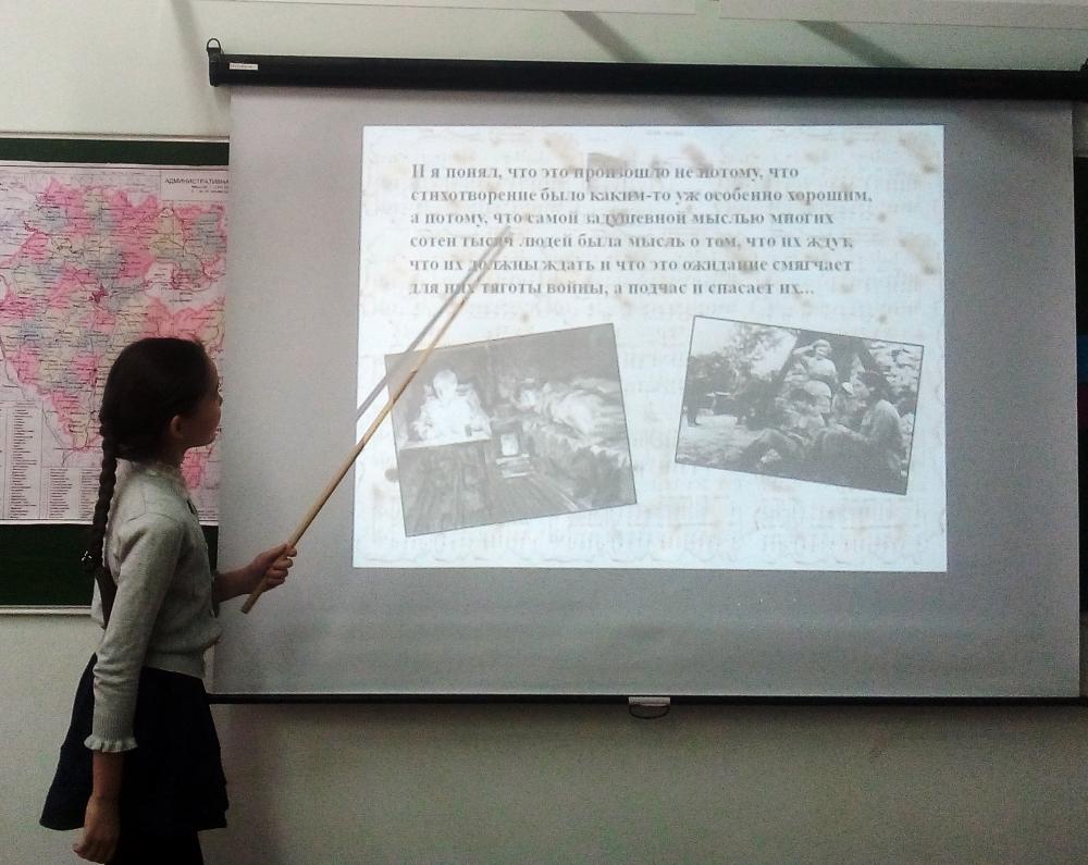 Треугольное фронтовое письмо друга погибшего нашего земляка стало главным предметом уроков мужества. Пусть никогда не будет войны! Пусть наши ученики ходят в школу за музыкой мира и добра, за хорошими знаниями! Молодое поколение благодарно солдатам за свободное небо над головой, за Россию.