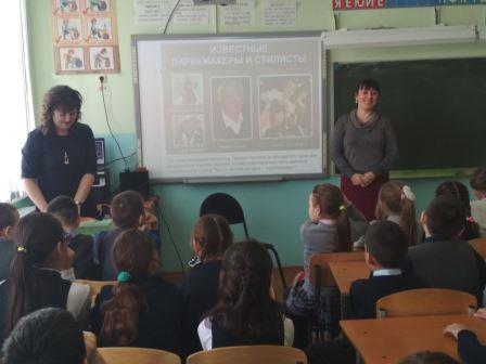 В рамках профориентационного декадника в 3-4 кл (3в, 4б, 4в) прошла встреча с парикмахером Сафутдиновой Ильнарой Айрасовной. Она очень увлекательно и интересно рассказала о своей профессии: как работает парикмахер, как ухаживать за волосами, какие инструменты использует парикмахер, какими качествами должен обладать парикмахер. В завершение встречи Ильнара Айрасовна показала свое мастерство на практике – она постригла челку одной из учительниц школы. Ребятам очень понравилась встреча. Они узнали много нового и интересного об этой профессии, о личностных качествах, которыми должен обладать человек, работающий в этой области