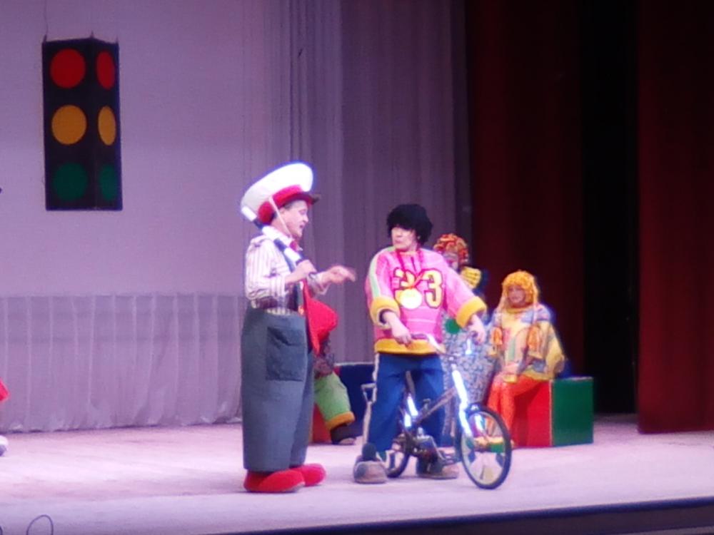 Проблема детского дорожно-транспортного травматизма в настоящее время весьма серьезна, и то, что необходимо прививать детям навыки поведения на дорогах, понимают многие взрослые. Но для детей заучивать любые правила - занятие довольно скучное, поэтому актеры театра решили преподнести им необходимый урок в увлекательной музыкальной и игровой форме. Недисциплинированный велосипедист Петя и его друзья изучают правила дорожного движения в занимательной игровой форме. Актеры в ярких костюмах разыгрывали различные ситуации, танцевали, пели песни, а персонаж представления в костюме инспектора ГИБДД по ходу спектакля разъяснял ребятам значение того или иного дорожного знака, учил, как и в каком месте положено переходить дорогу.