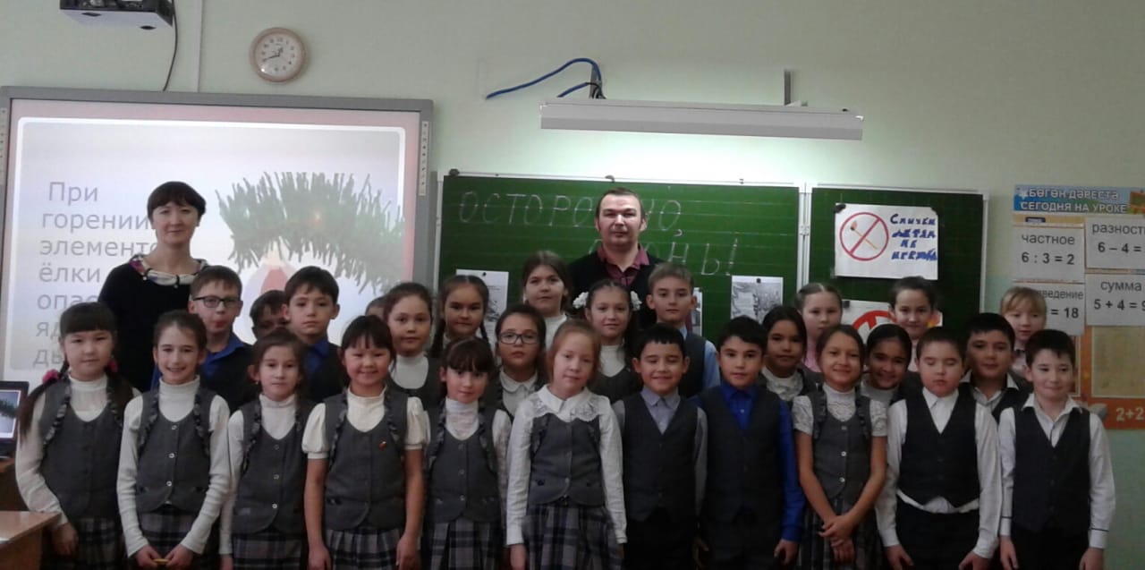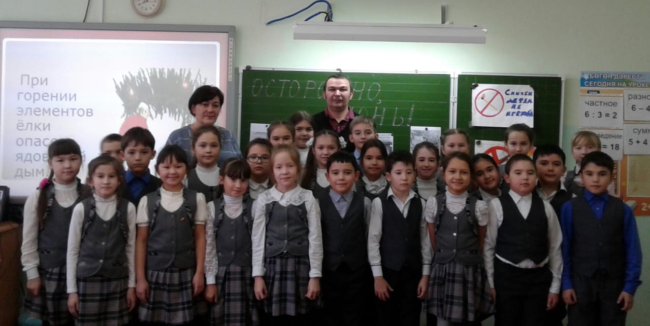 Радик Мавлавиевич провел беседу с детьми, целью которой было закрепление с учащимися правил пожарной безопасности, электробезопасности в быту и предупреждение пожаров и несчастных случаев во время проведения новогодних праздников и во время зимних каникул. На конкретных примерах детям была предоставлена информация о том, к каким непоправимым последствиям может привести неправильное обращение с петардами, елочными гирляндами, бенгальскими огнями и фейерверками. В ходе беседы обучающиеся еще раз повторили правила безопасного поведения во время проведения новогодней елки в школе, учились прогнозировать небезопасные ситуации на улице и дома, во избежание несчастных случаев и пожаров. А потом обучающиеся с большим интересом посмотрели обучающий мультфильм «Уроки осторожности тетушки Совы» и получили советы мудрой Совы.