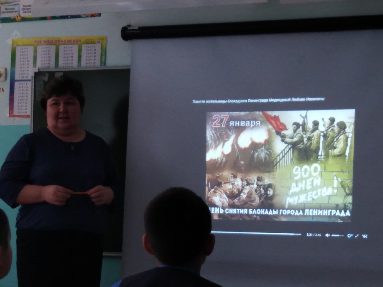В рамках месячника по военно-патриотическому воспитанию 27 января в 4б классе прошел классный час «День снятия блокады Ленинграда». Классный час начался с песни «Священная война». Далее классный руководитель, Л.Ш.Мулланурова, рассказала о страшных днях в Ленинграде. Рассказ сопровождался показом презентации. Сулимов Ильназ подготовил выступление «Таня Савичева». Ребята услышали печальную историю ленинградской девочки Тани Савичевой. Её большая семья жила на Васильевском острове. Блокада отняла у неё всех родных. В те жуткие дни Таня сделала девять коротких трагических записей, кто и когда умер. При первой же возможности Таню вывезли в Горьковскую область. Но крайнее истощение, нервное потрясение сломили девочку, и она вскоре умерла. Многое перенесли ленинградцы, но народ не сдавался. 13 января 1944 года город полностью был освобожден от блокады. В честь выигранного сражения 27 января 1944 года над Невой прогремели 24 залпа торжественного салюта.