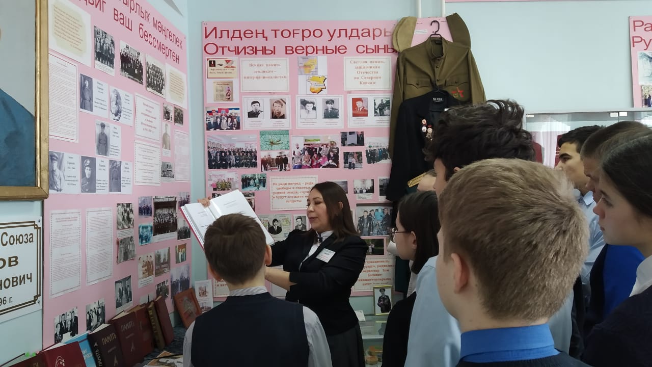В рамках месячника по военно-патриотическому воспитанию обучающиеся 8б класса МБОУ СОШ №1 с.Верхние Татышлы посетили историко-краеведческий музей. В ходе экскурсии дети познакомились с экспонатами времен Великой Отечественной войны. Это и пожелтевшие письма-треугольники, которые бойцы писали своим родным, военные формы солдатов, предметы военного быта, личные вещи и награды участников Великой Отечественной войны. Детям разрешили подержать и рассмотреть солдатскую каску и флягу для воды, а также примерить шлем радиста.