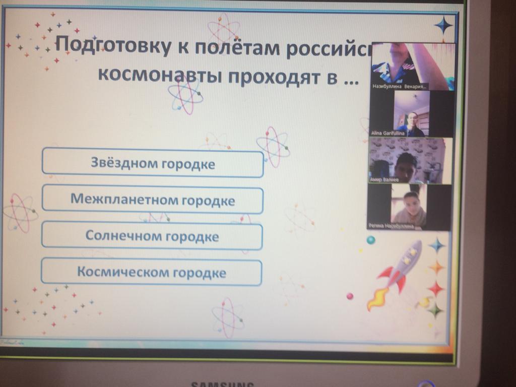 Для обучающихся 10б класса МБОУ СОШ №1с. Верхние Татышлы была проведена онлайн – викторина, посвященная Дню космонавтики. Классный руководитель Назибуллина В.У. подготовила викторину – презентацию, которая состояла из двух частей: первая - на выбор одного правильного ответа, вторая - на единственно правильный ответ. Учащиеся показали хорошие знания по истории космонавтики, а также узнали много интересных фактов.