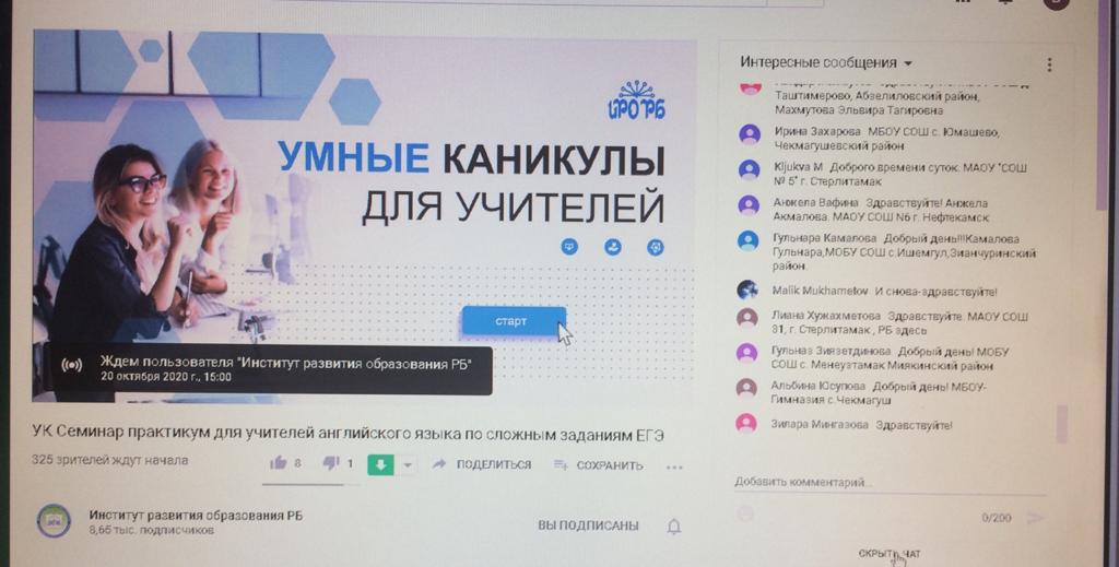 20 октября 2020 года учителя английского языка МБОУ СОШ №1 с.Верхние Татышлы приняли участие на семинаре в рамках «Методических осенних каникул» на тему «Выполнение сложных заданий ЕГЭ по английскому языку», организованном Институтом развития образования РБ.