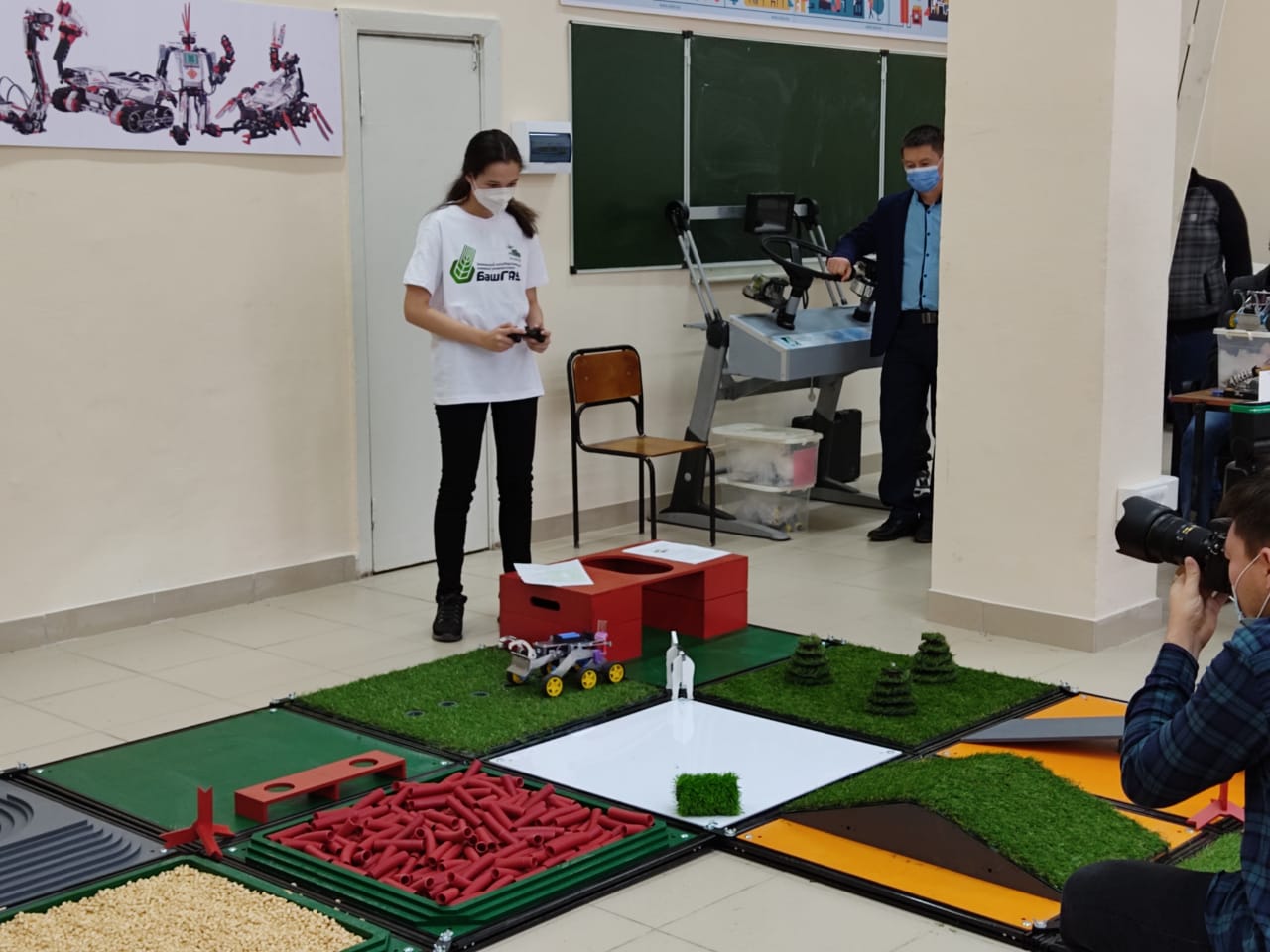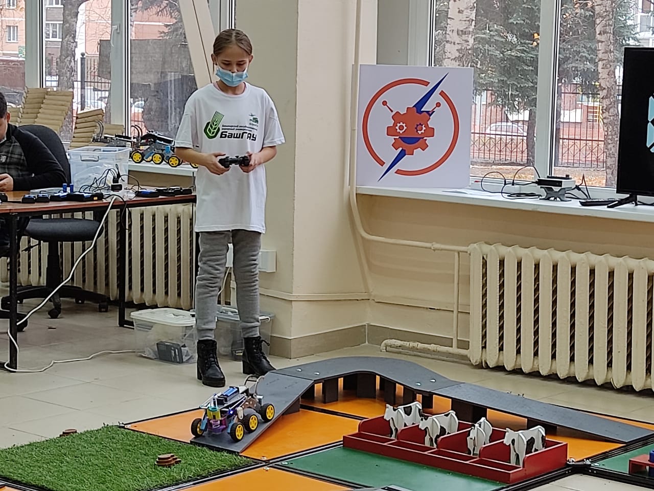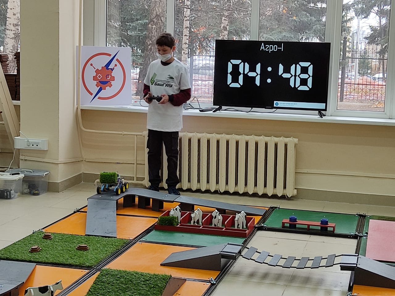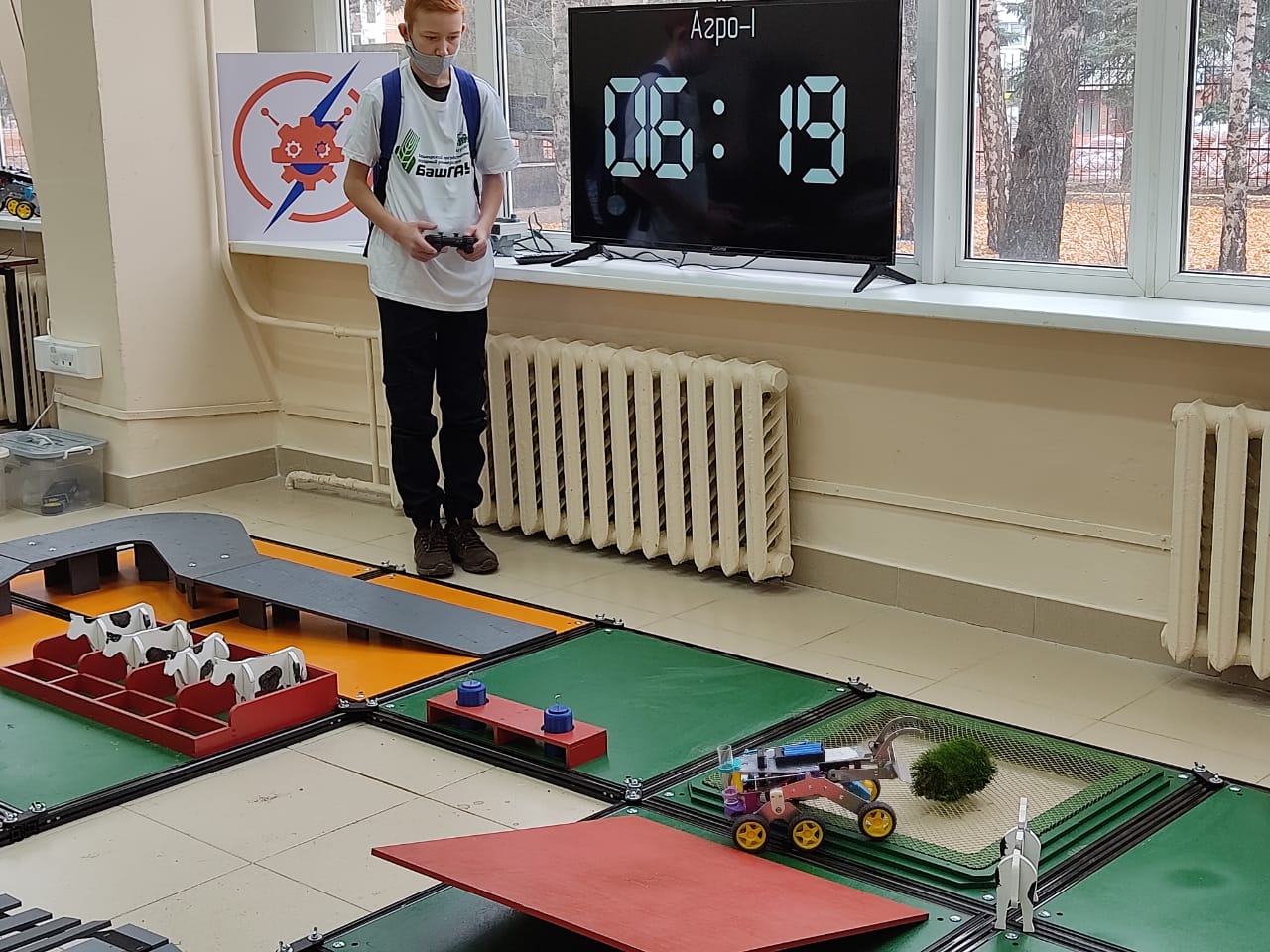 На очном этапе для выполнения испытания было выделено 8 минут. За это время нужно было преодолеть полигон при помощи радиоуправляемого робота, выполняя по пути различные задания (доставить молоко на ферму, накормить коров, посадить картофель). Тимур Шайдуллин мастерски управился своим роботом и занял III место по Республике Башкортостан.