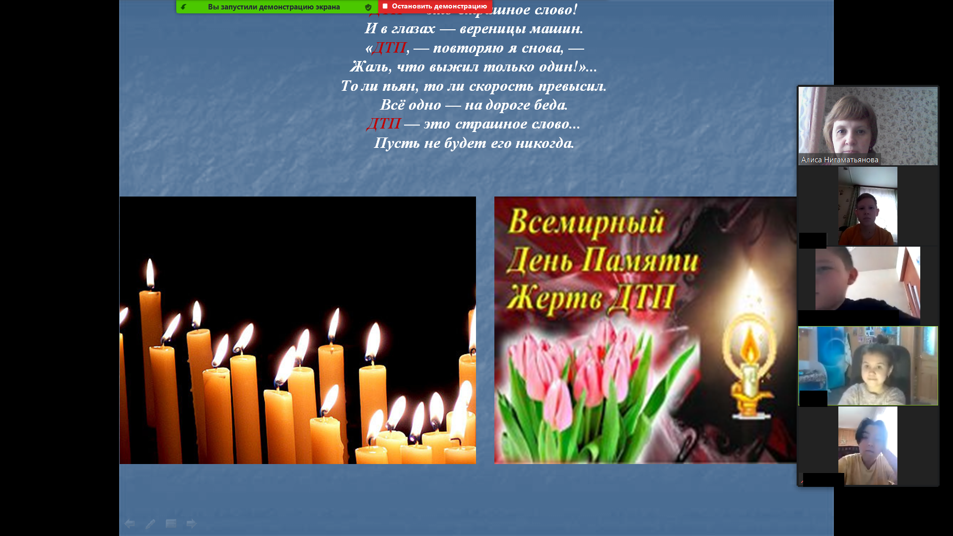 Ежегодно в третье воскресенье ноября, согласно решению Генеральной Ассамблеи ООН, отмечается Всемирный день памяти жертв дорожно – транспортных происшествий. В 6а классе МБОУ СОШ √1 с. Верхние Татышлы прошло занятие по внеурочной деятельности, приуроченное к этому памятному дню. Целью данного мероприятия является формирование у обучающихся ценности жизни и ответственности за свою жизнь и здоровье, усиление дисциплины на дороге, развитие внимательности и способности предугадывать развитие событий на дороге. В ходе занятия учащиеся вспомнили правила дорожного движения.