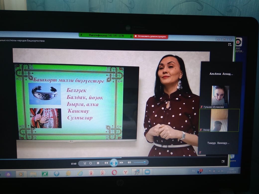 Авхадиева А.Х. рассказала обучающимся 6-х классов о национальном башкирском костюме и провела викторину, онлайн-экскурсию в музей национальной одежды. Учитель с учениками 3-4х классов провела уроки «Башкирский национальный костюм». Ребята научились рисовать орнамент башкирской национальной одежды, познакомились с историей возникновения костюма и обогатили свой словарный запас. Фатхуллина Л.Р..провела уроки в 3 б классе, просмотрели видео, ответили на вопросы, потом на листочках нарисовали национальные костюмы. Нуриханова З.Ф. провела онлайн-уроки в 7а классе по национальным костюмам. На уроке дети познакомились с историей и особенностями национального костюма и традициями башкирского народа, проживающего на территории Республики Башкортостан.