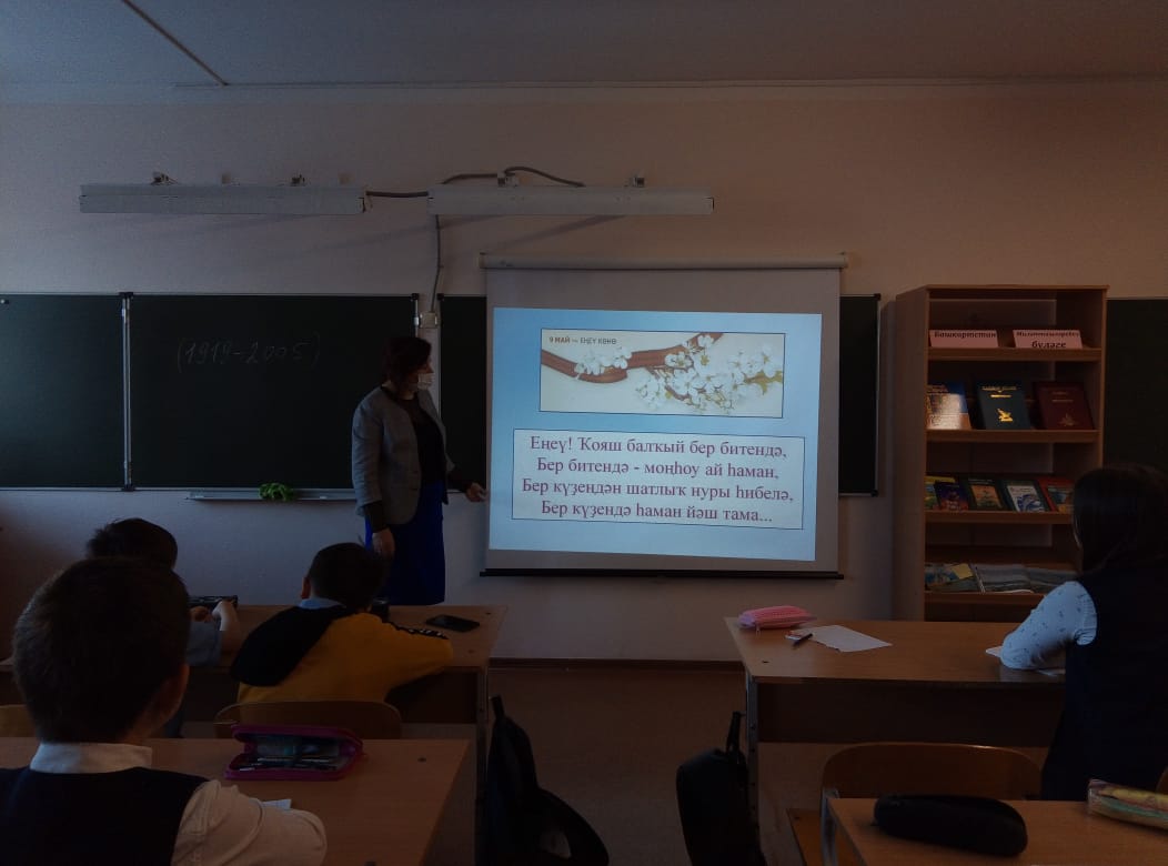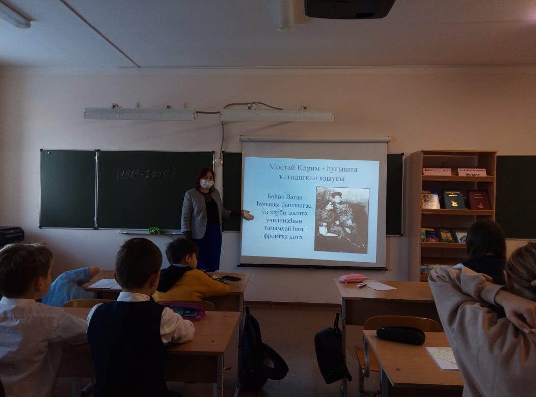 Учитель башкирского языка и литературы З.Ф. Нуриханова провела урок, посвященный творчеству и жизни народного поэта Башкортостана Мустая Карима. На занятии учащиеся узнали много интересного о знаменитом поэте, писателе, драматурге. Учитель рассказала о величии поэта, о его заслугах, вклад которого в культуру Башкортостана и России неоценим, читали отрывки из стихов «Россиянмын», «Ҡайын япрағы тураһында». Использовались видеоматериалы-кадры хроники, записи стихов в авторском исполнении, а также музыка, ведь на стихи Мустая Карима написано немало песен.