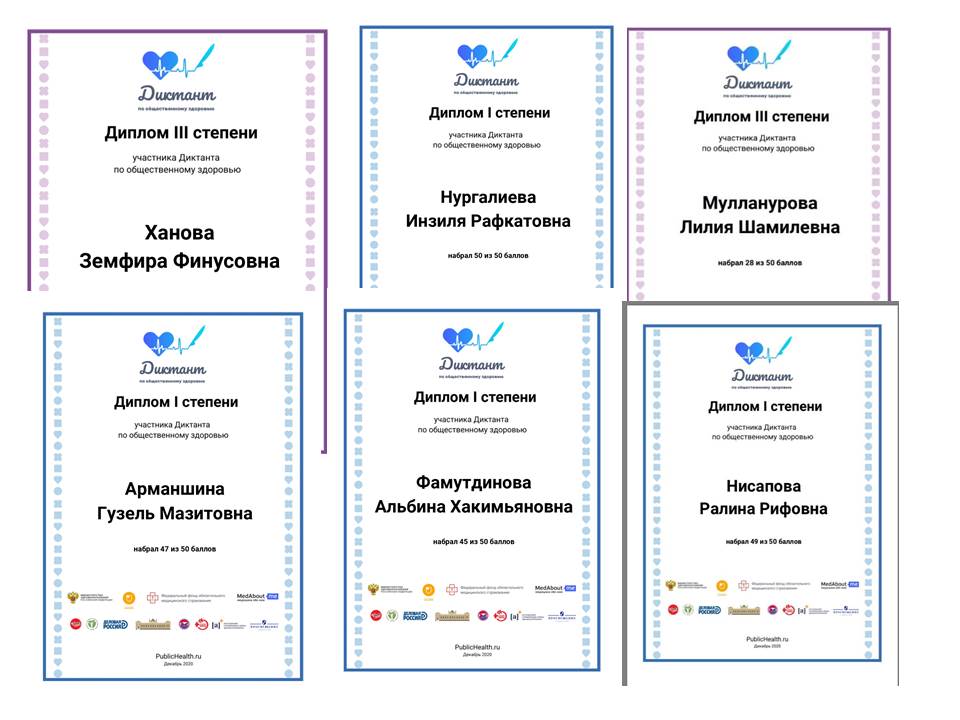 МБОУ СОШ №1с.Верхние Татышлы принимает участие во Всероссийском диктанте по общественному здоровью. Участники диктанта имеют возможность получить представление об основах общественного и личного здоровья и проверить общий уровень знаний в этих областях. Задания диктанта в форме теста, состоящего из 50 вопросов, на каждый из которых есть только один правильный ответ. Лучшие участники награждаются дипломами. Пройти диктант можно на сайте publichealth.ru.