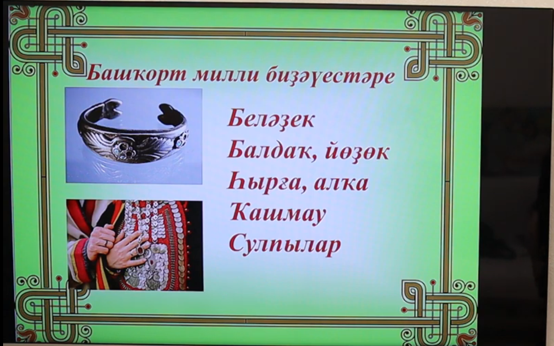 Башҡорт милли кейеме — башҡорт халҡының баш, өҫ һәм аяҡ кейеме. Милли кейем — халыҡтың эске булмышының сағылышы. Кеше үҙенең күңел донъяһын кейеме аша асып бирергә ынтылһа, милләттеңдә йәшәү рәүеше, көнкүреше, эскедонъяһы — тышҡы ҡиәфәтендә сағыла. “Милли кейемдә уҡыйбыҙ” Республика акцияһында ҡатнашып, Әүхәҙиева А.Һ. 8 – се класта “Башҡорт милли кейеме” темаһына дәрес үткәрҙе. Уҡыусылар кейем һәм биҙәүес атамалары менән таныштылар, һүҙлек байлығын арттырҙылар һәм милли музейҙа сәйәхәт иттеләр.