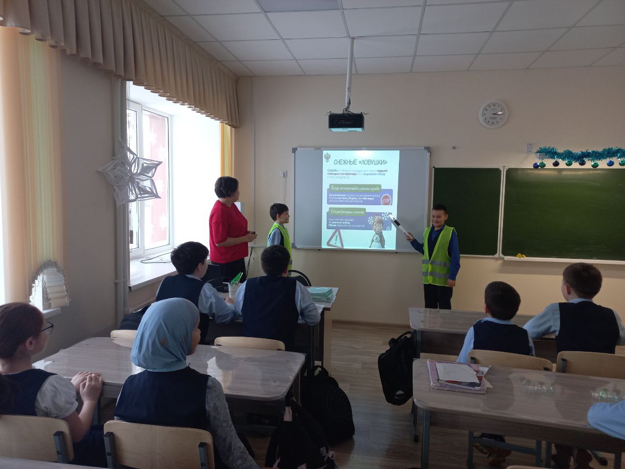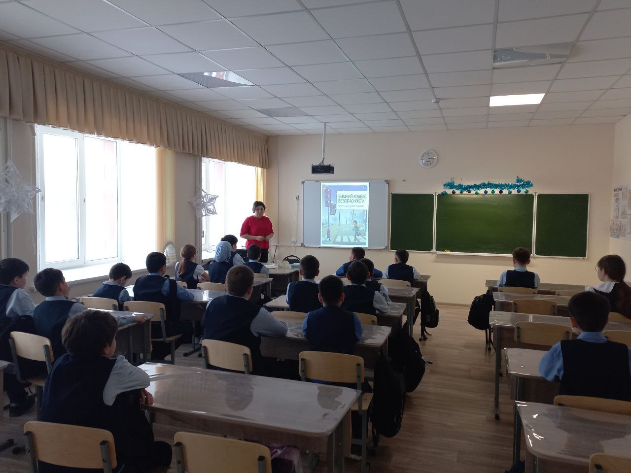 В рамках профилактической акции «Внимание - дети!» руководитель ЮИД Ахунова З.Р. в 5Б классе провела урок на тему «Зимний кодекс безопасности». На уроке были обсуждены основные правила безопасного поведения зимой на улице: как правильно переходить дорогу, как вести себя на скользких тротуарах и во время снегопадов. Внимание было уделено правилам безопасности при катании на санках, коньках и лыжах.