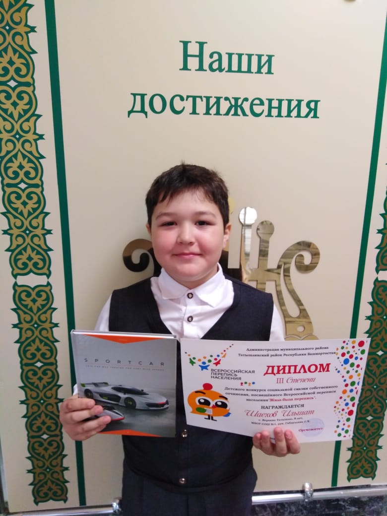 Администрацией муниципального района Татышлинский район Республики Башкортостан был проведен детский конкурс социальной сказки собственного сочинения "Жила-была перепись..." Данный конкурс проводился с целью привлечения внимания общества к Всероссийской переписи населения 2021 г., а также формирования позитивного отношения к переписи у детей и подростков, повышения роли и значимости предстоящей переписи. Среди победителей есть обучающийся 3б класса МБОУ СОШ №1 с. Верхние Татышлы Шаехов Ильшат, руководитель Г. Х. Габдуллина. Он занял 3 место в категории от 6 до 8 лет, был награжден дипломом и памятным подарком.